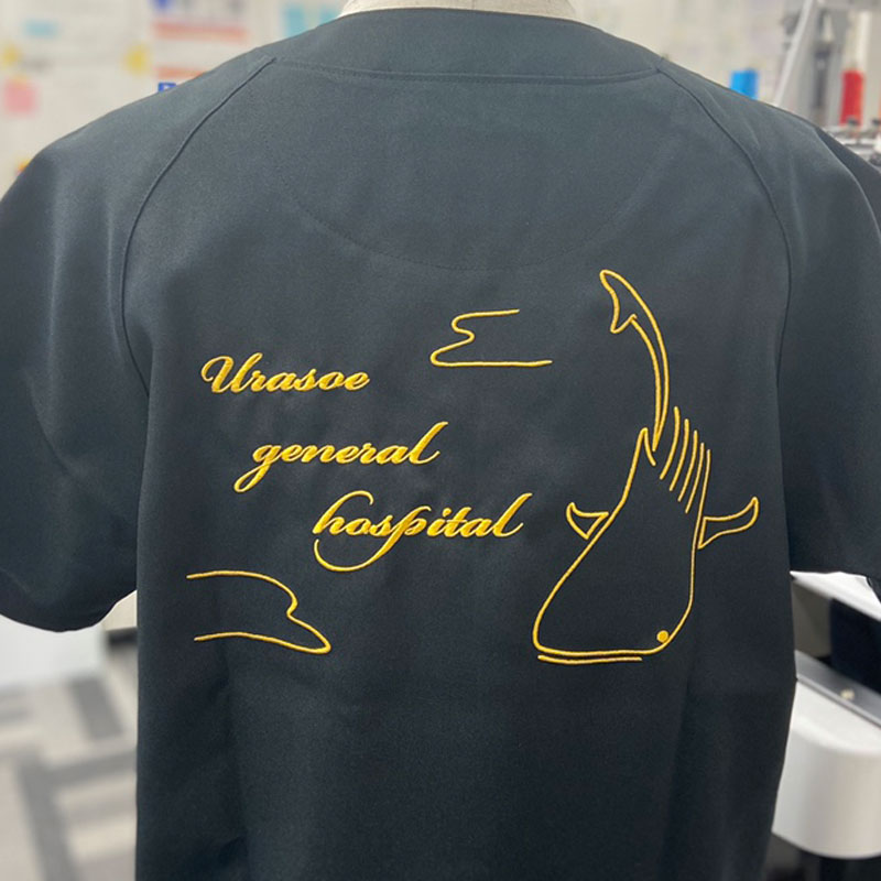 デザイン刺繍 浦添総合病院2020様 Dランク動物背中 浦添総合病院2020様スクラブロゴマーク刺繍デザインのご紹介です。このたびは製作のご依頼ありがとうございました。 このデザインについて 【刺繍加工のポイント】 背中の刺繍範囲のマックスサイズです。 スクラブの背中の刺繍範囲:28×18㎝ 刺繍位置 :背中 刺繍サイズ:左右28cm、天地17.5㎝ 刺繍カラー:1色 ゴールド 針数は約13000針で、範囲は広いのですが針数が抑えられたので、通常の背中の刺繍価格よりも若干安くなりました。 使用スクラブ:MIZUNO MZ-0021スクラブ ブラック この記事をシェア