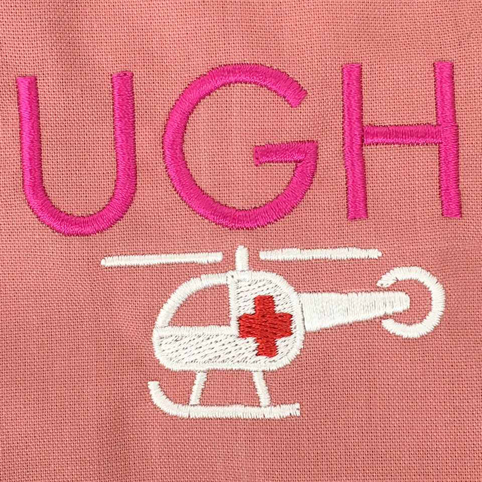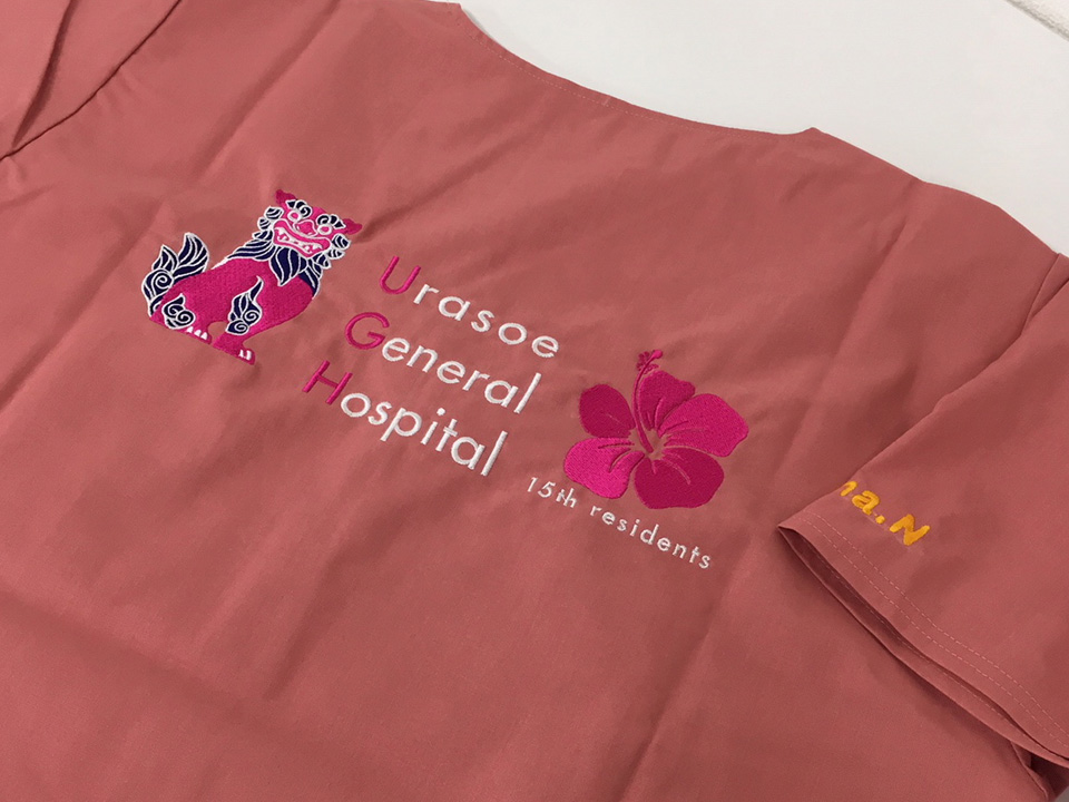 デザイン刺繍 浦添総合病院研修医様 かわいいドクターヘリ動物背中胸花複雑タイプ高運針数デザイン 浦添総合病院研修医15期様スクラブロゴマーク刺繍デザインのご紹介です。 このデザインについて 【刺繍加工のポイント】 背中のシーサーはかなりの針数です。糸密度も高くしていますので、立体的な仕上がりとなっています。 刺繍位置 :背中/右胸 刺繍サイズ:背中28㎝/右胸6.7㎝ ドクターヘリサイズ左右5.2㎝ 刺繍カラー:背中 3色 ホワイト・ホットピンク・ネイビー 右胸 3色 ホワイト・ホットピンク・レッド 使用スクラブ:Dickies 7033SCスクラブ この記事をシェア