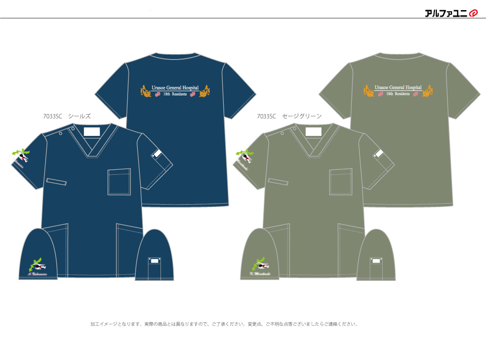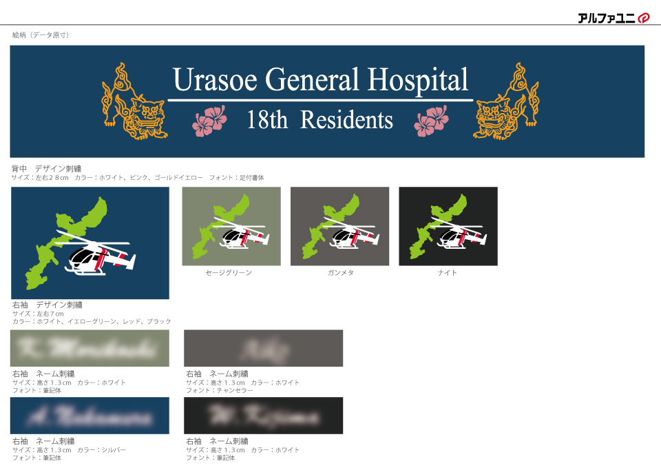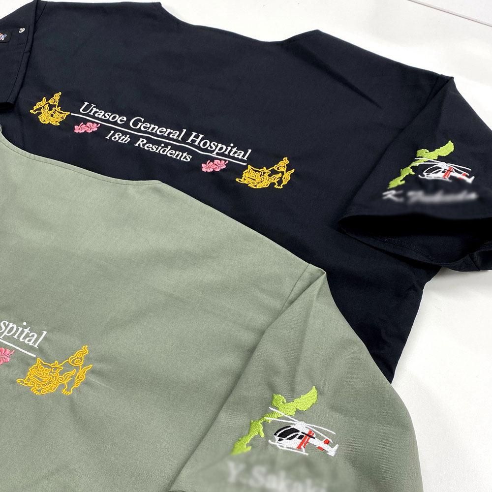 デザイン刺繍 浦添総合病院18期研修医様 CランクDランクドクターヘリ動物地図背中花袖複雑タイプ 浦添総合病院18期研修医様スクラブロゴマーク刺繍デザインのご紹介です。このたびは製作のご依頼ありがとうございました。 このデザインについて 【刺繍加工のポイント】 背中のシーサーのイラストについて、当初いただいた原案は複雑でかつ線の中を埋める表現でしたが、 刺繍をする上で、針数を抑えてきれいに再現できるよう当方で調整しました。 簡素化した上で針数としては2万針を超えてします。 ドクターヘリについても簡素化することで刺繍代を抑えることができました。 刺繍位置 :左袖/背中 刺繍サイズ:左袖左右7cm/背中左右28cm 刺繍カラー:左袖4色 <窓黒埋め>・S01.ホワイト・S07.レッド・S02.ブラック・S20.イエローグリーン /背中3色 S01.ホワイト・S48.ピンク・S12.ゴールドイエロー 使用スクラブ:Dickies 7033SCスクラブ この記事をシェア