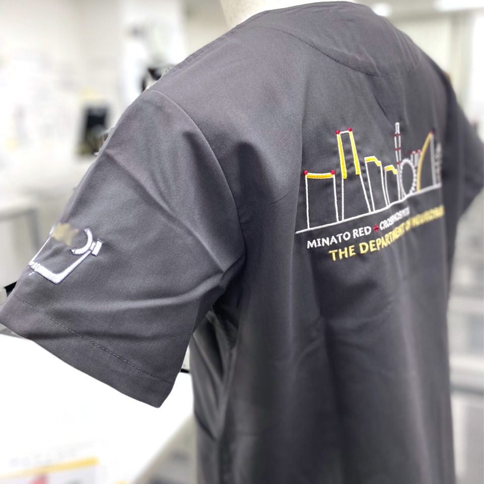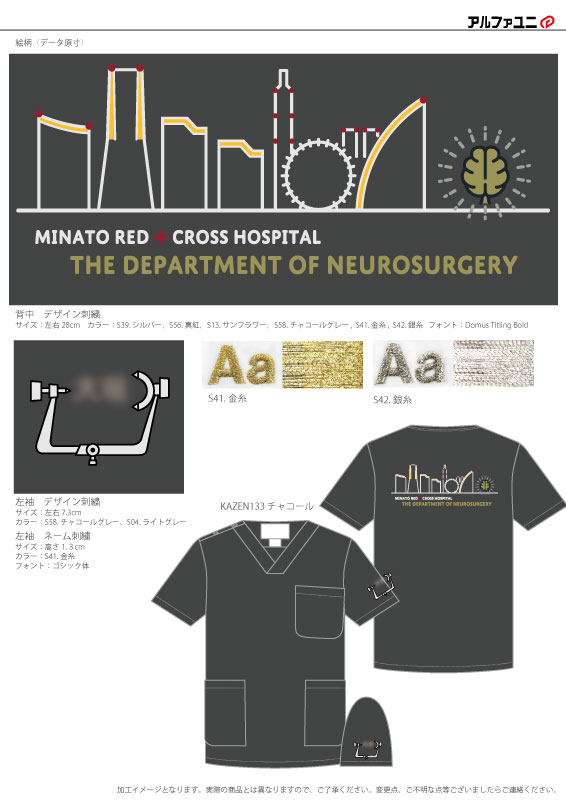 デザイン刺繍 横浜市立みなと赤十字病院脳神経外科様 133 CランクDランク建物背中袖赤十字マーク風景 横浜市立みなと赤十字病院脳神経外科様スクラブロゴマーク刺繍デザインのご紹介です。このたびは製作のご依頼ありがとうございました。 このデザインについて 【刺繍加工のポイント】 左袖にデザイン刺繍とネーム刺繍を入れました。 通常はデザインの下にネームを配置するのですが、今回お客様のご要望により、ネーム刺繍をデザイン刺繍の中に入れる形でレイアウトしました。 スペースが限られているため、ネームの幅は左右3㎝程度です。 刺繍位置 :背中/左袖 刺繍サイズ:左右28cm/左右7.3cm 刺繍カラー:6色 シルバー・真紅・サンフラワー・チャコールグレー・金糸・銀糸/2色 チャコールグレー・ライトグレー 使用スクラブ:カゼン(KAZEN) 133 スクラブ この記事をシェア