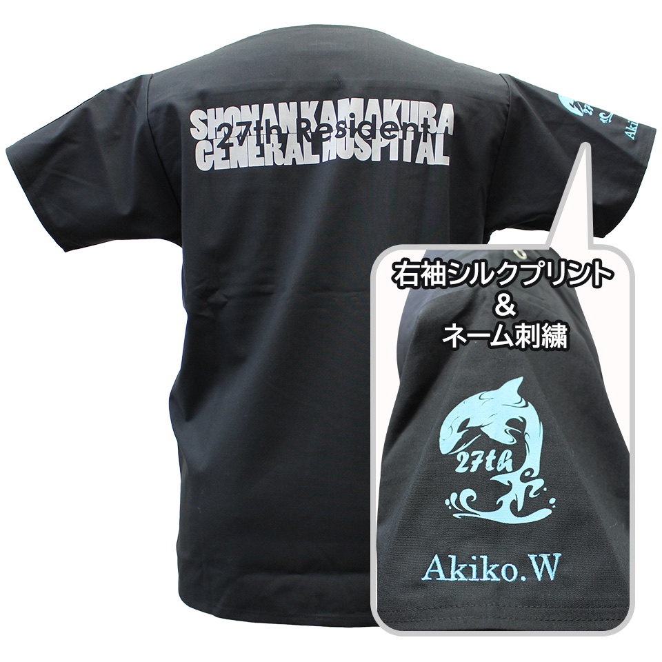 人気の7033SCスクラブの背中に、大きくロゴと病院名をプリントと袖にネーム刺繍をいれたカッコいいチームスクラブ。