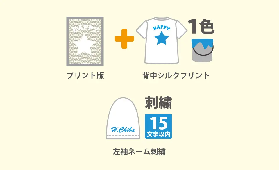 背中にシルクプリント、左袖にネーム刺繍の組み合わせです。