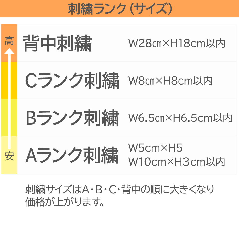 ご予算に余裕があれば、迫力のある背中へのデザイン刺繍がおすすめです。細部までこだわった美しい刺繍加工が可能です。