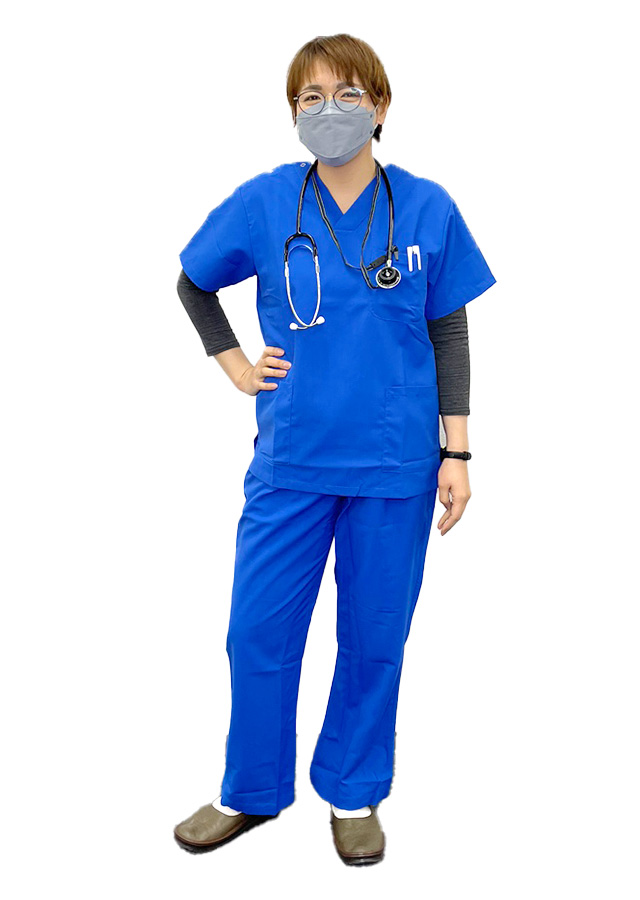 ナチュラルなグリーンのスクラブにイエローのネーム刺繍を入れることによって、落ち着いた中にも明るい印象を与えられると思ったことと、おしゃれに見えることからです!