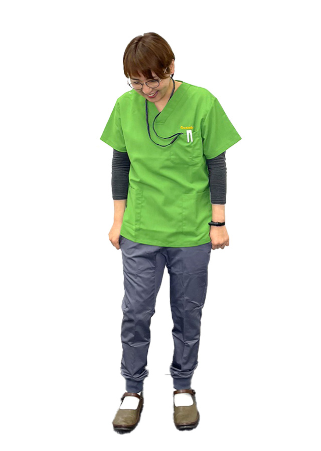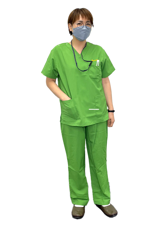 若い樹木の葉のようなリーフグリーンのスクラブに、落ち着いたグレーのジョガーパンツを合わせました。 フレッシュで明るいイメージがありつつも落ち着いた印象になると思い、この組み合わせを選びました!