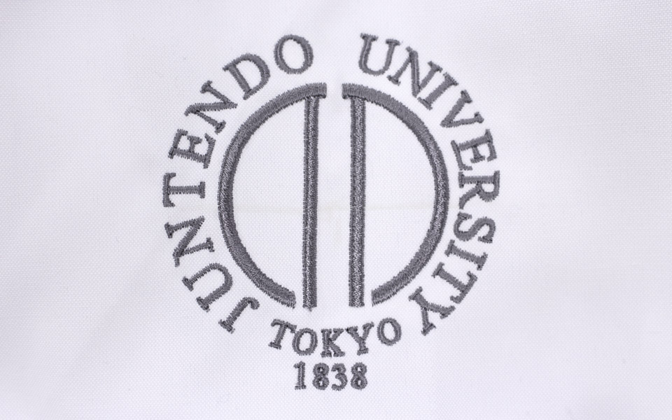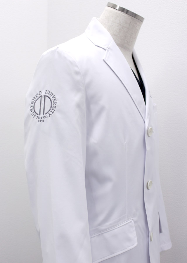 人気の内容は左右どちらかの「袖」にロゴや校章、イラストのデザイン刺繍、「左胸ポケット口上」に個人ネームまたは病院名の文字刺繍の2箇所加工です。デザイン刺繍見本では、順天堂大学様の校章を糸色「ダークグレー」、個人名と名称を糸色「ダークネイビー」で刺繍しています。ドクターコートの刺繍色は上品にみえるシックな色合いを選ぶ方が多いようです。