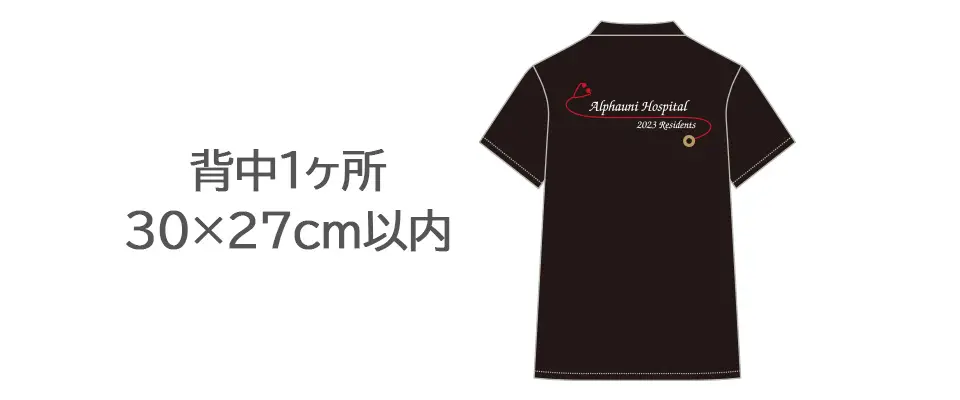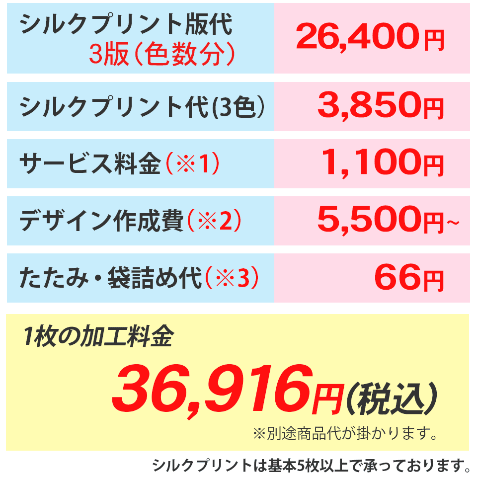 シルクプリント加工で背中1ヶ所3色・5枚注文で1あたりの加工代は7,040円(税込) 3,300円のスクラブも含めると10,340円(税込)