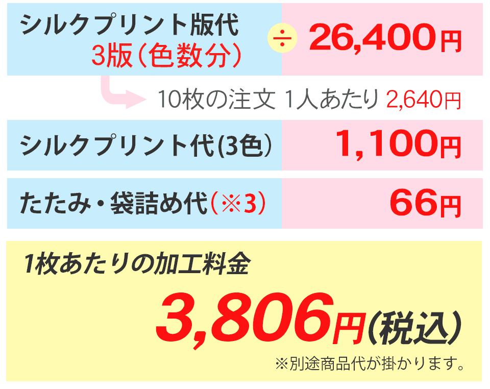 シルクプリントは色数ごとにかかる版代がある分、注文枚数が少ないと1人あたりの加工代は高額になります。