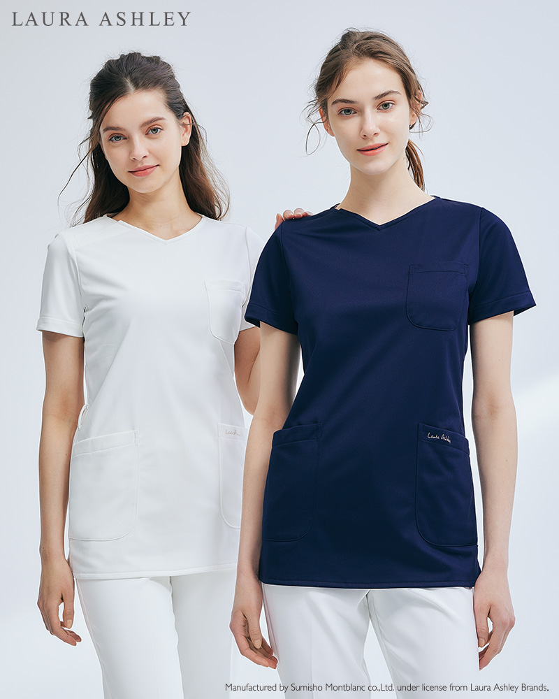 かわいいだけじゃなく、上品さも感じるローラアシュレイのスクラブ。スクラブの上にドクターコートを羽織ると大人かわいいコーディネートに。