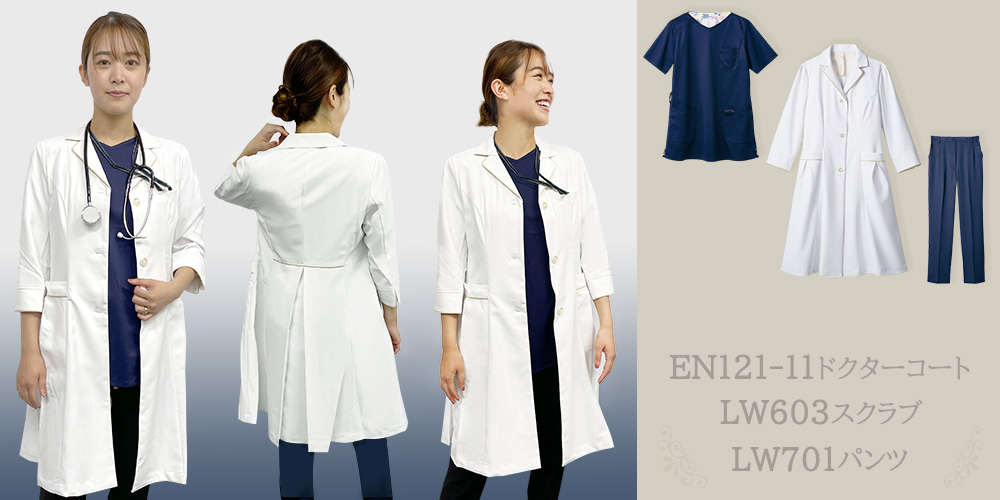 上品なスクラブとドクターコート、パンツでキレイに決まる。おちついたカラーが魅力的なコーディネート。
