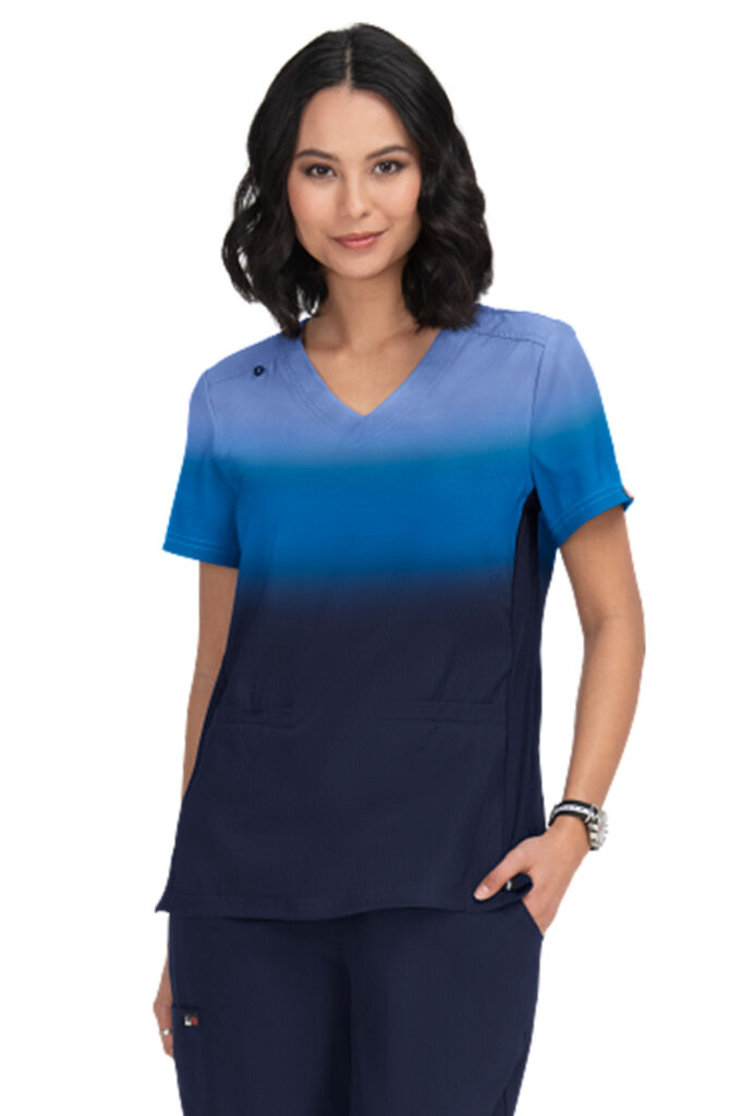 クラシックなVネックで両腰にウェルトポケット、IDバッジが吊り下げられるバンジーループ付。2WAYストレッチで動きやすいスクラブです。