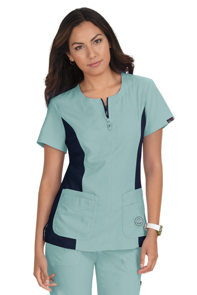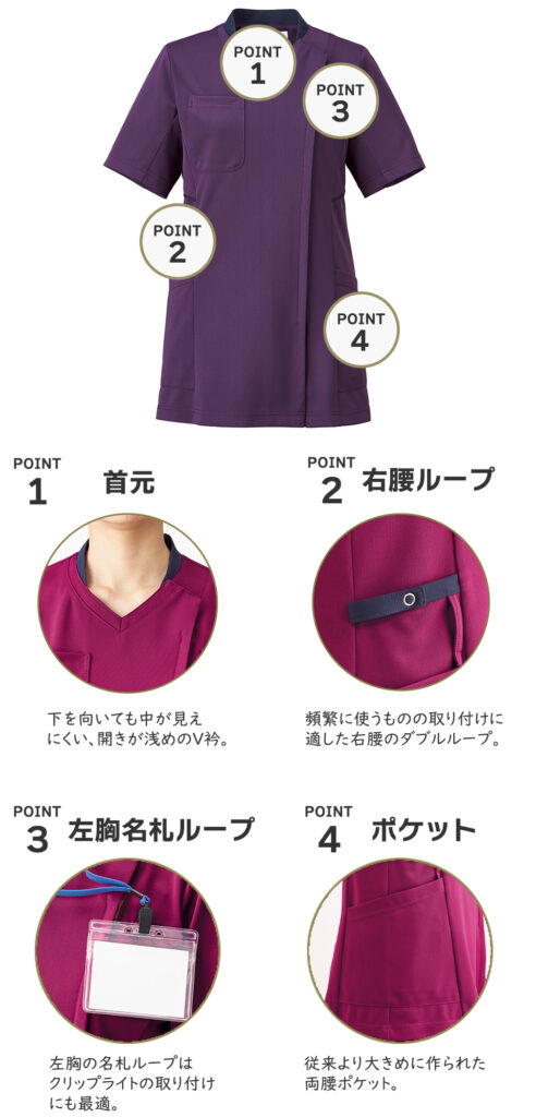 抜群の機能性で、医療行為の動きからデスクワークまで、ユニフォームによるストレスを軽減します。豊富なポケット収納付き。