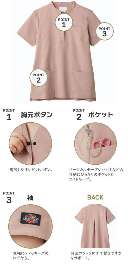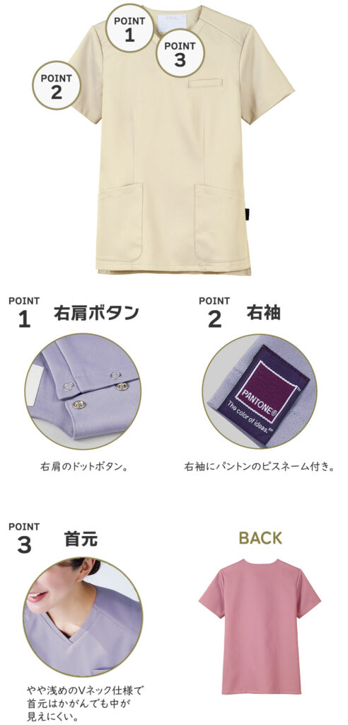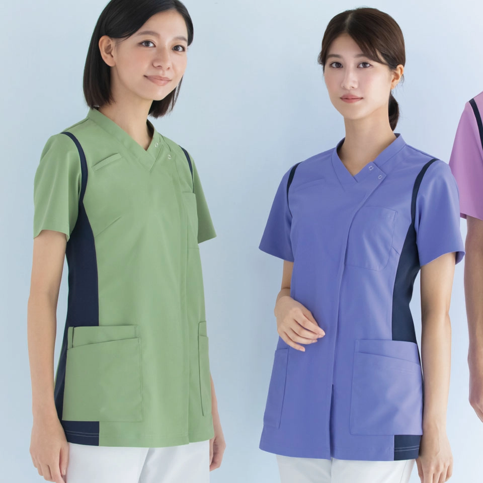 おしゃれで女性らしいデザインのスクラブや、脱着のしやすさや胸元などに女性ならではの工夫が施されたスクラブなどを豊富に取り揃えております。