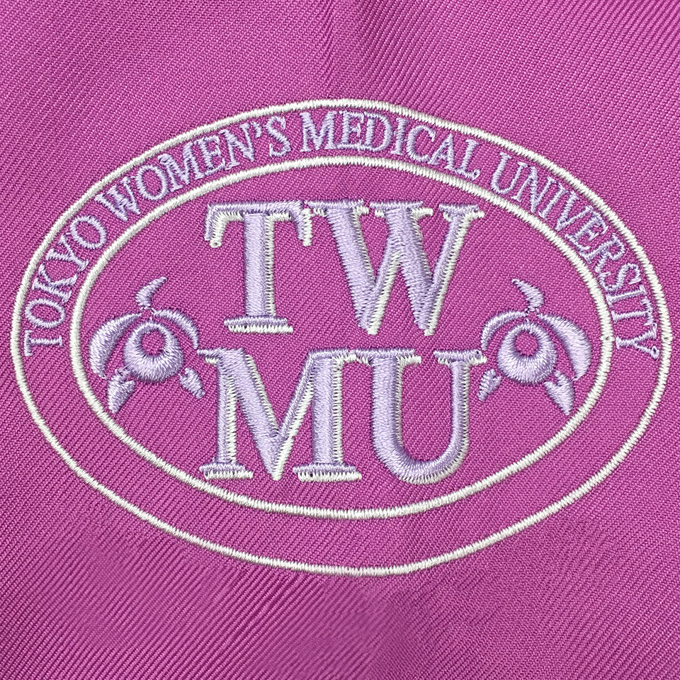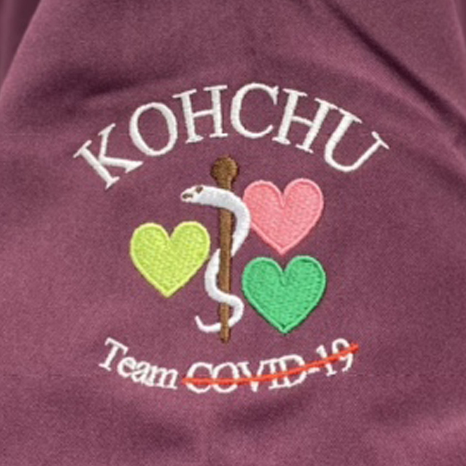 校章や病院のロゴ刺繍を入れてチームの団結力アップにも。校章刺繍はアルファユニ保有の刺繍型を使えば、刺繍代のみで加工できるのでかなりお得です。