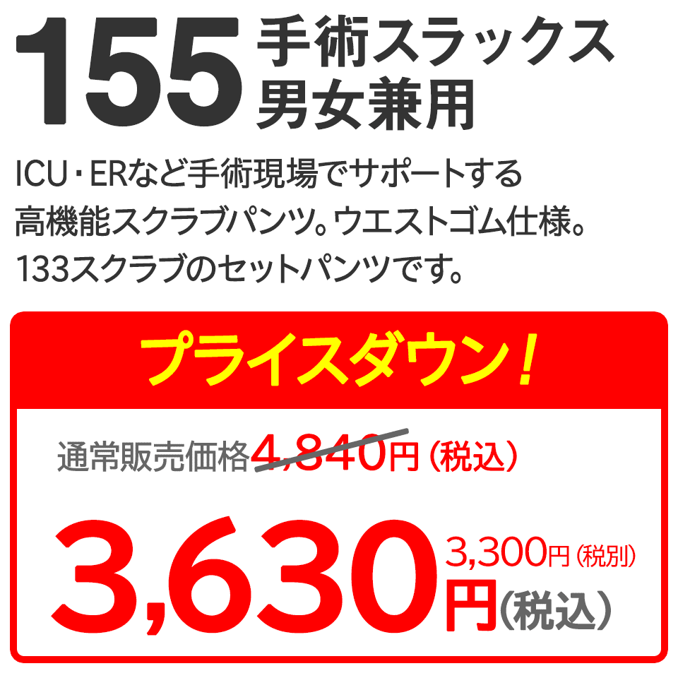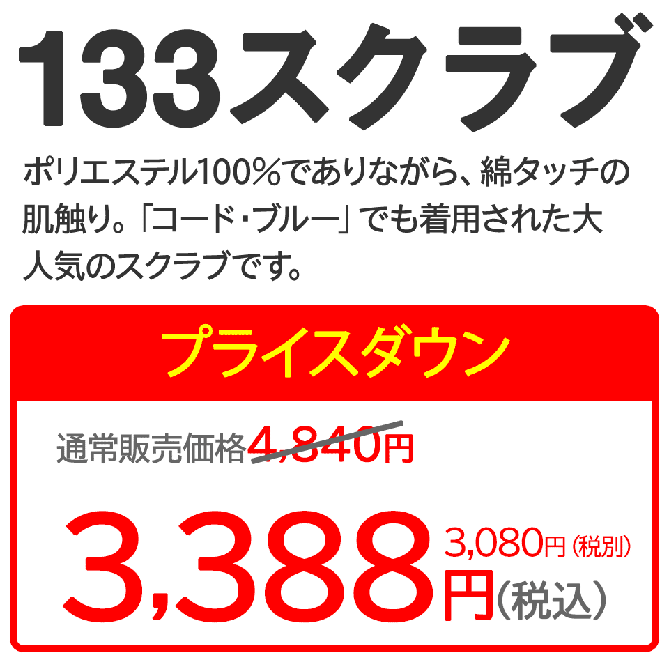 133スクラブのセットパンツ。ウエストゴムでラクラク、ポリエステル100%でありながら、綿タッチの肌触りと優れた吸汗・速乾性をもつ、高機能スクラブパンツ。