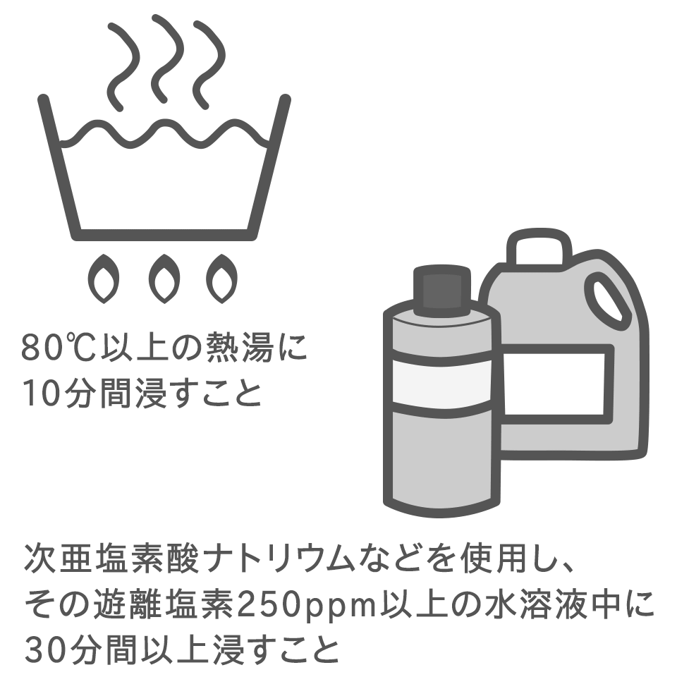 (1)厚生省の手引きに書かれた80℃以上の熱湯に10分間浸すことで殺菌処理をする。(2)次亜塩素酸ナトリウムへ浸染による殺菌消毒。