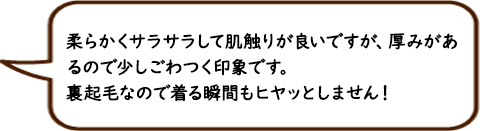 内側が起毛のつくりにで保温性に優れるだけでなく、長めの着丈でお腹周りの冷えも防止します。