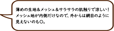 メッシュ地で熱がこもりにくいため、不快な暑さを低減できます。