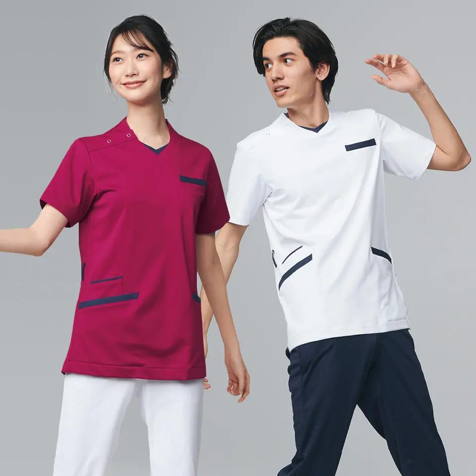 身体のラインを綺麗に見せたいけど少しゆとりのあるサイズが多いスクラブ…。Z1004はウエスト部分を若干絞った綺麗なシルエットでスタイリッシュなオシャレさを演出!単色のシンプルなデザインかつ豊富なカラーバリエーションで人を選びません。袖に切り替えの縫い目がないのもポイント!腕の動きやすさにつながるとともにすっきりとした見た目を実現しています。各カラーのセットパンツも用意されているので、同色を選べばコーディネートも簡単!