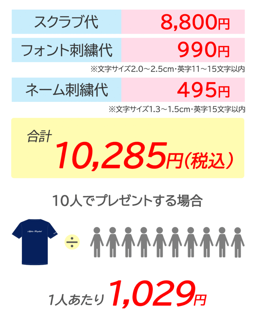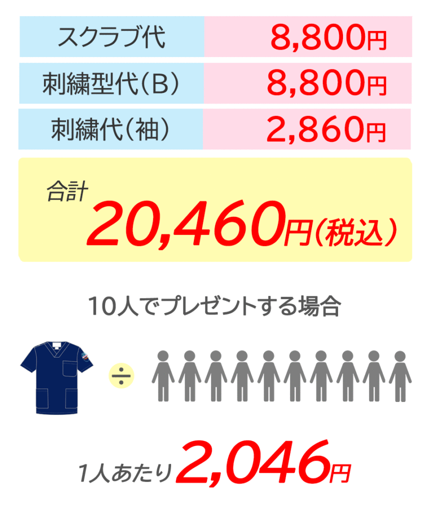 8,000円のスクラブの背中にえらべるフォント刺繍、袖にネーム刺繍を入れた場合の価格例です。