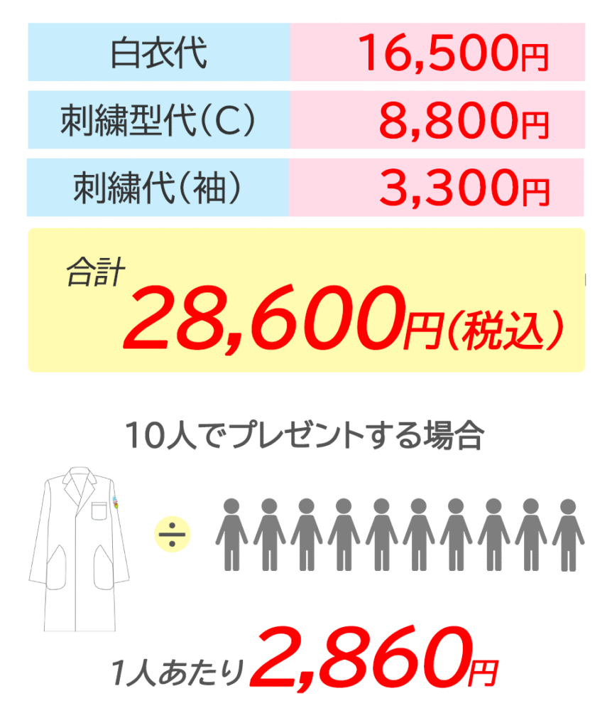 15,000円の白衣の袖にデザイン刺繍(Cランク)を入れた場合の価格例です。
