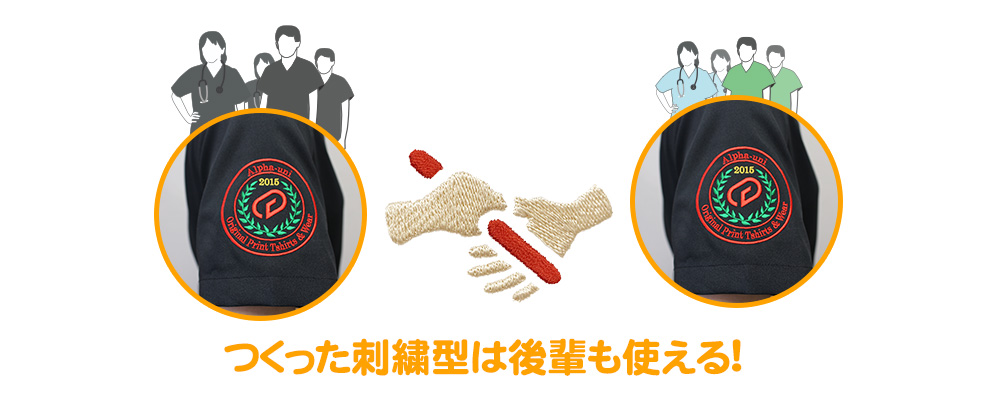 刺繍型代が0円!アルファユニ保有の刺繍型を使えば、刺繍代のみで加工できるのでかなりお得です。刺繍代はかんたんなもので500円から!(※刺繍単価は枚数や柄によって異なります)大学校章についてはお気軽にお問い合わせくださいませ!