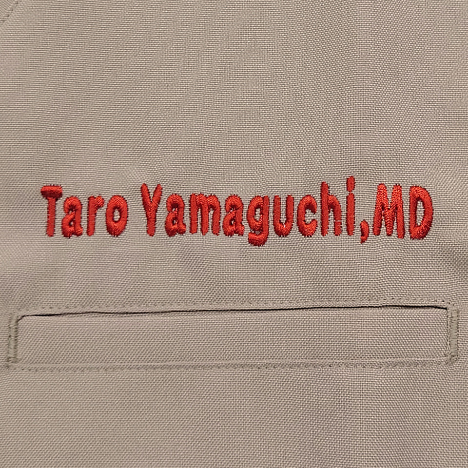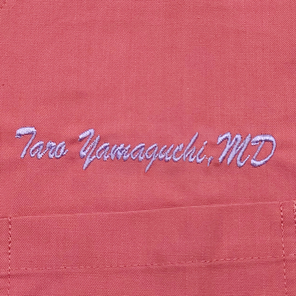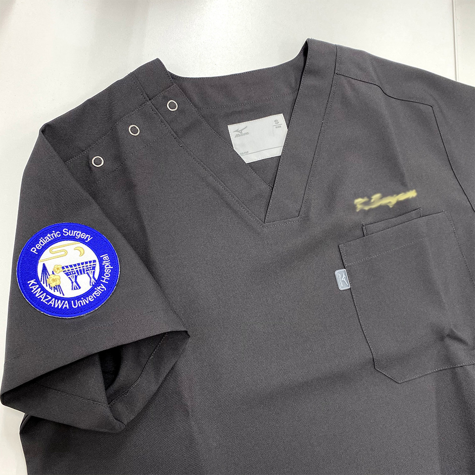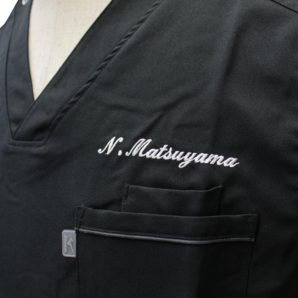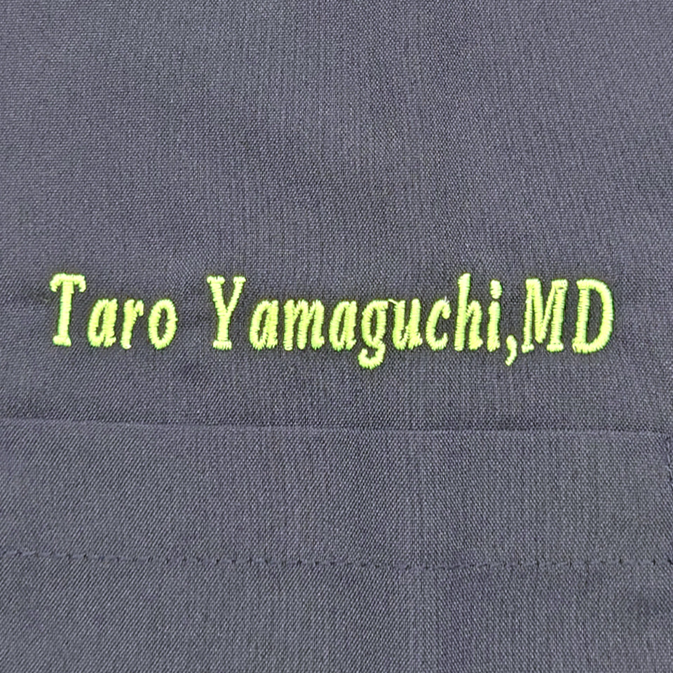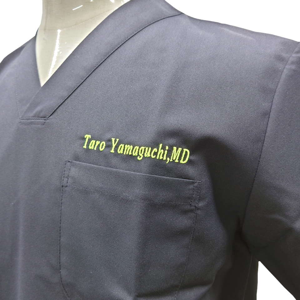 アルファユニなら、スクラブ・白衣を綺麗で存在感のあるネーム刺繍を入れることができるんです!