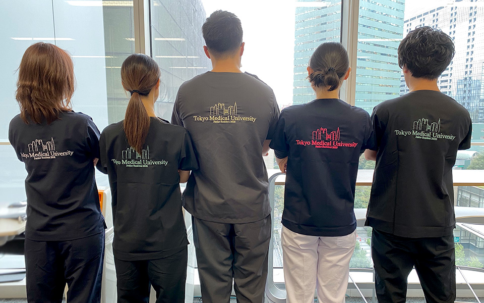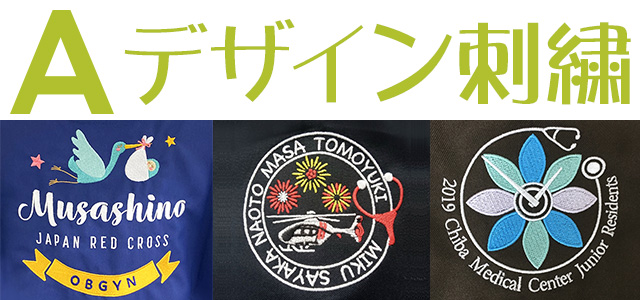 東京医科大学病院様の背中デザイン刺繍。「細かいところまでイメージ図通りで、刺繍も美しく、大変満足のいく仕上がりでした」とコメントをいただきました。色違いの背中刺繍が個性があり、かっこいいスクラブに仕上がりました。