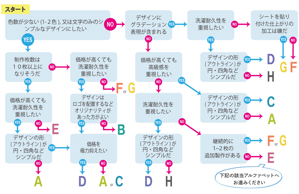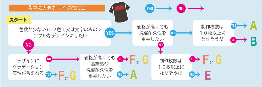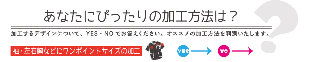 どんな加工がよいか迷っている方はまず、チャートをお試しください。加工位置別で選べます。加工方法の比較や人気の背中刺繍もあります。