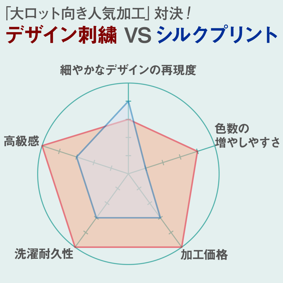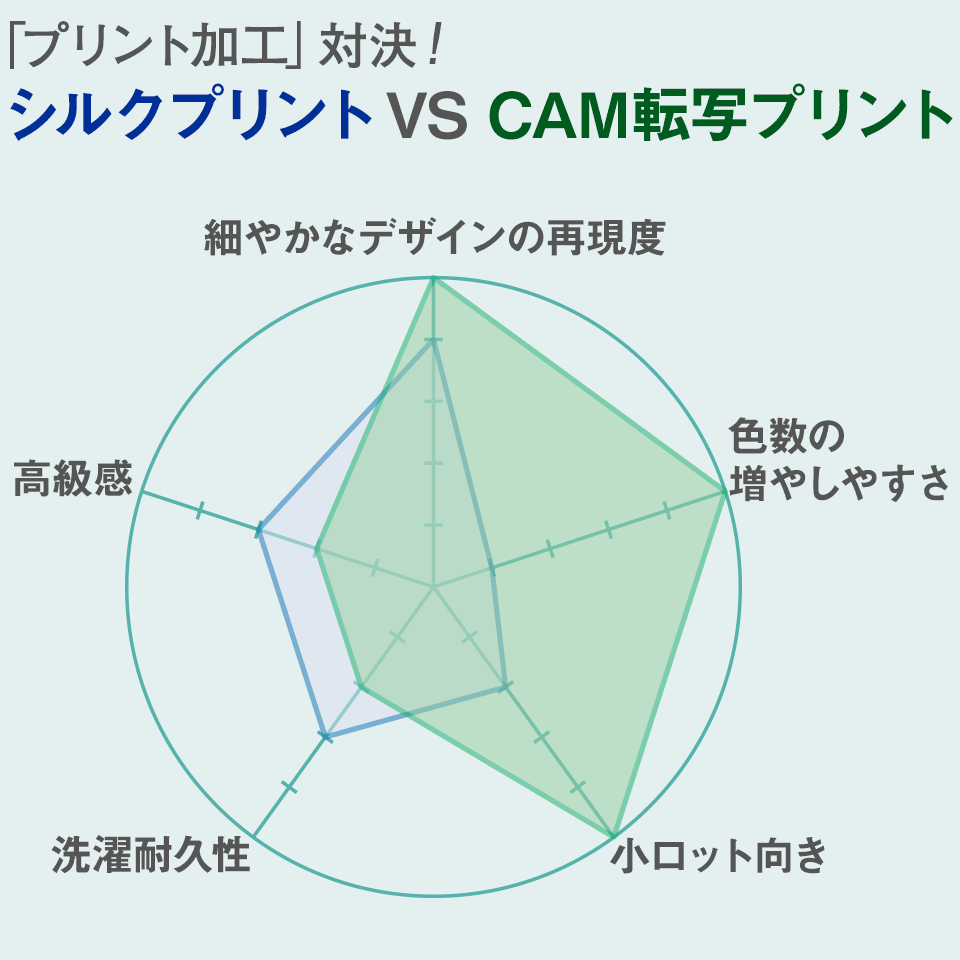転写プリントは小ロットで複雑なデザインに対応できるが、多少チープな仕上がりに。