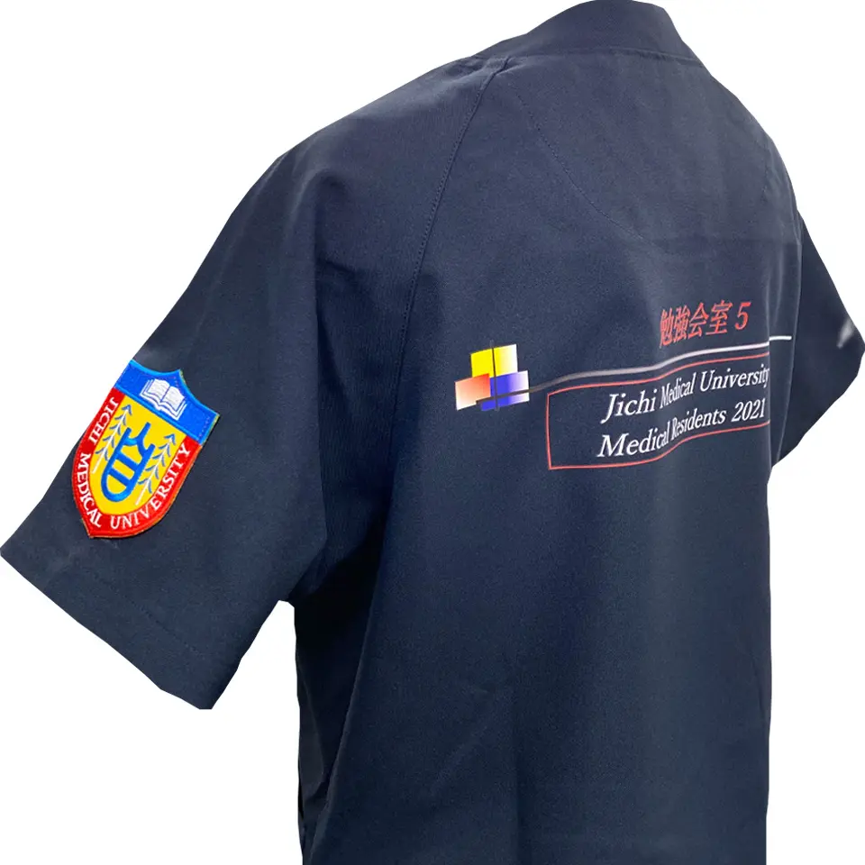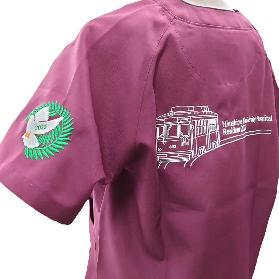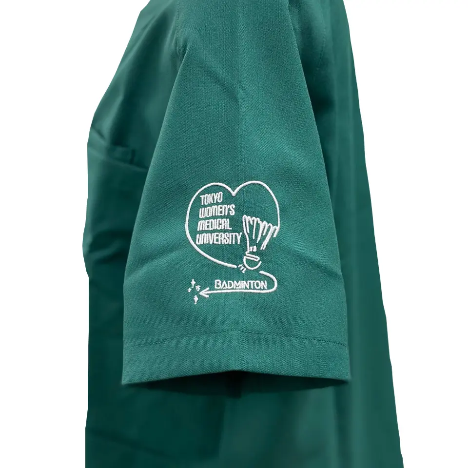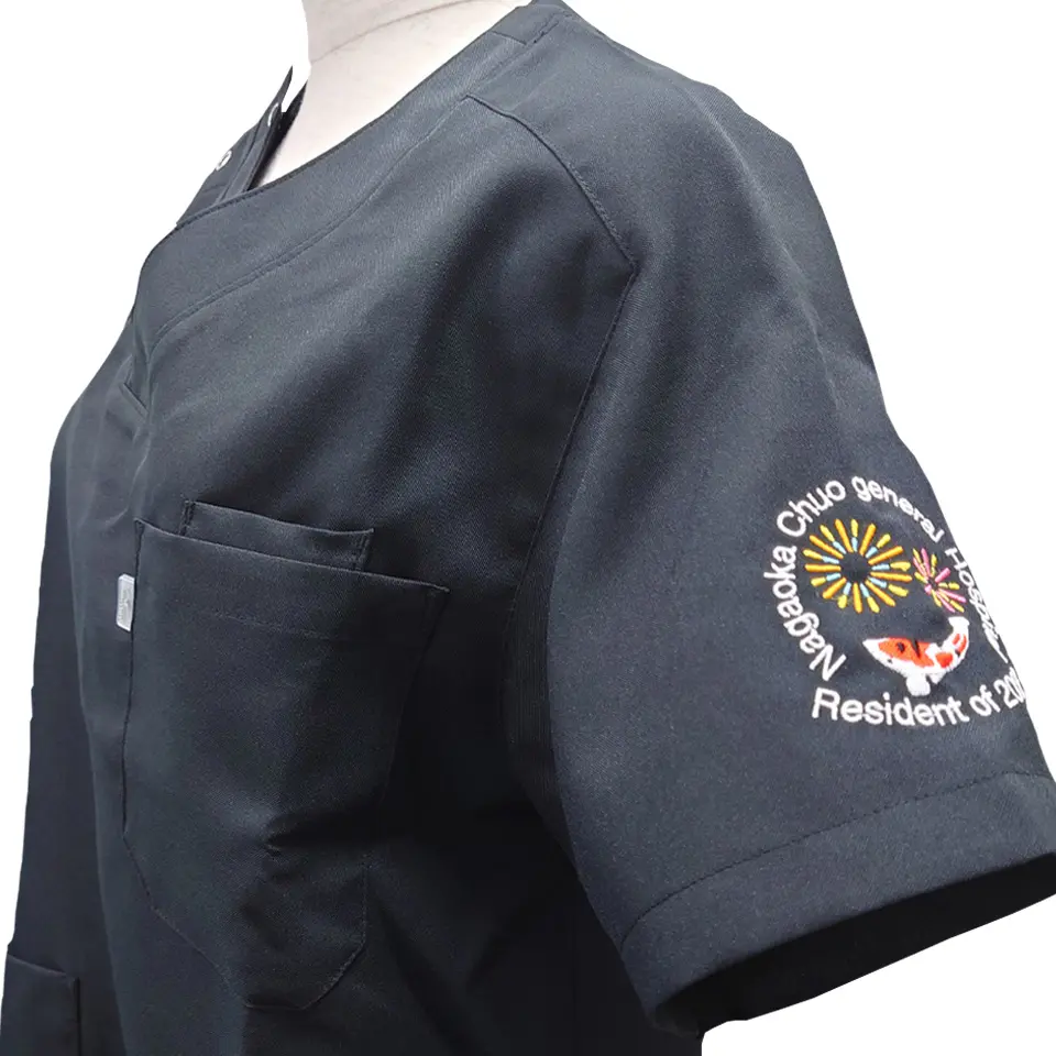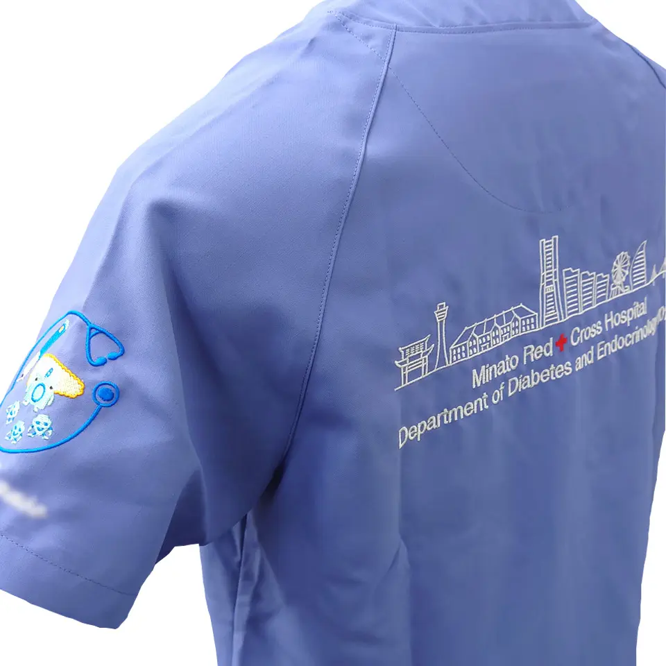 袖にはデザイン刺繍を入れるとより印象に残るスクラブに!病院や大学のロゴを入れれば一体感も高まること間違いありません。