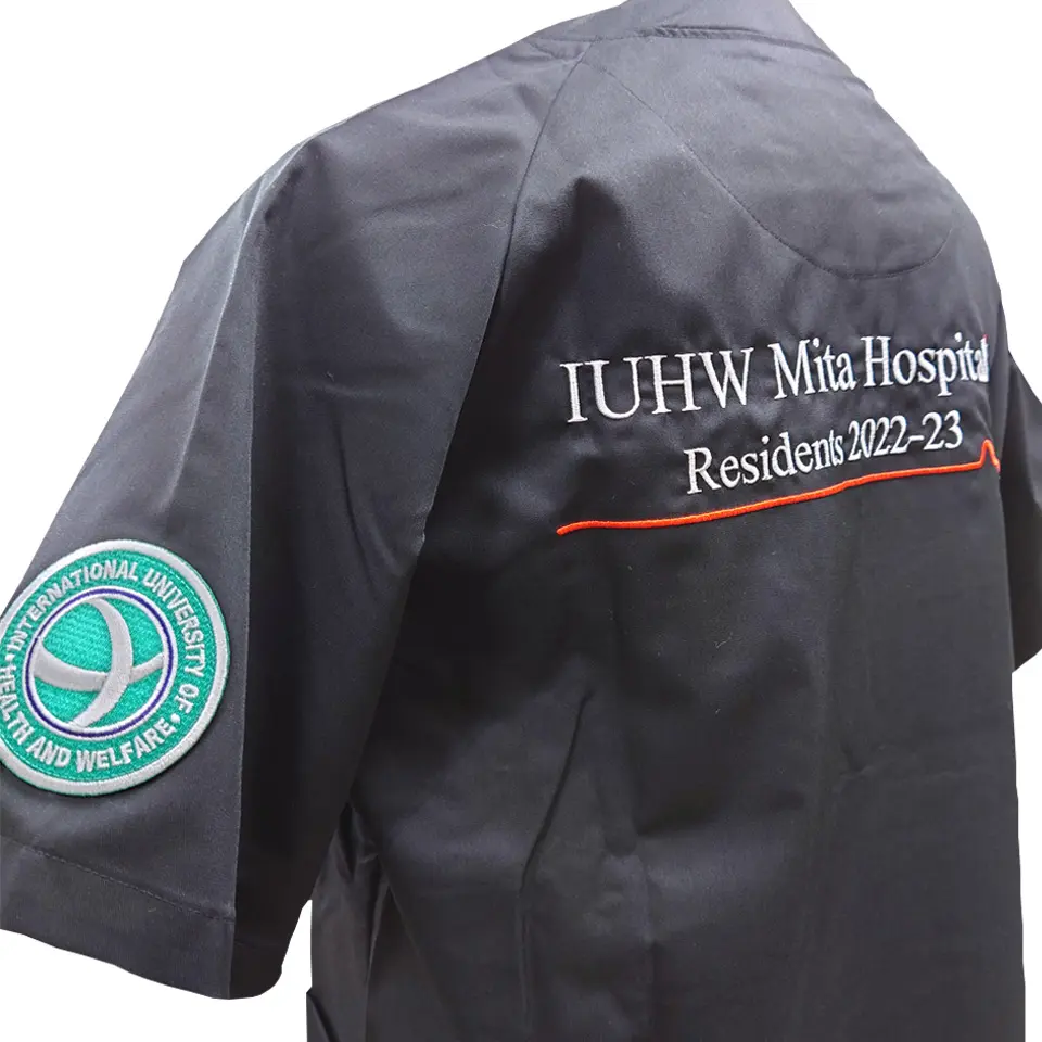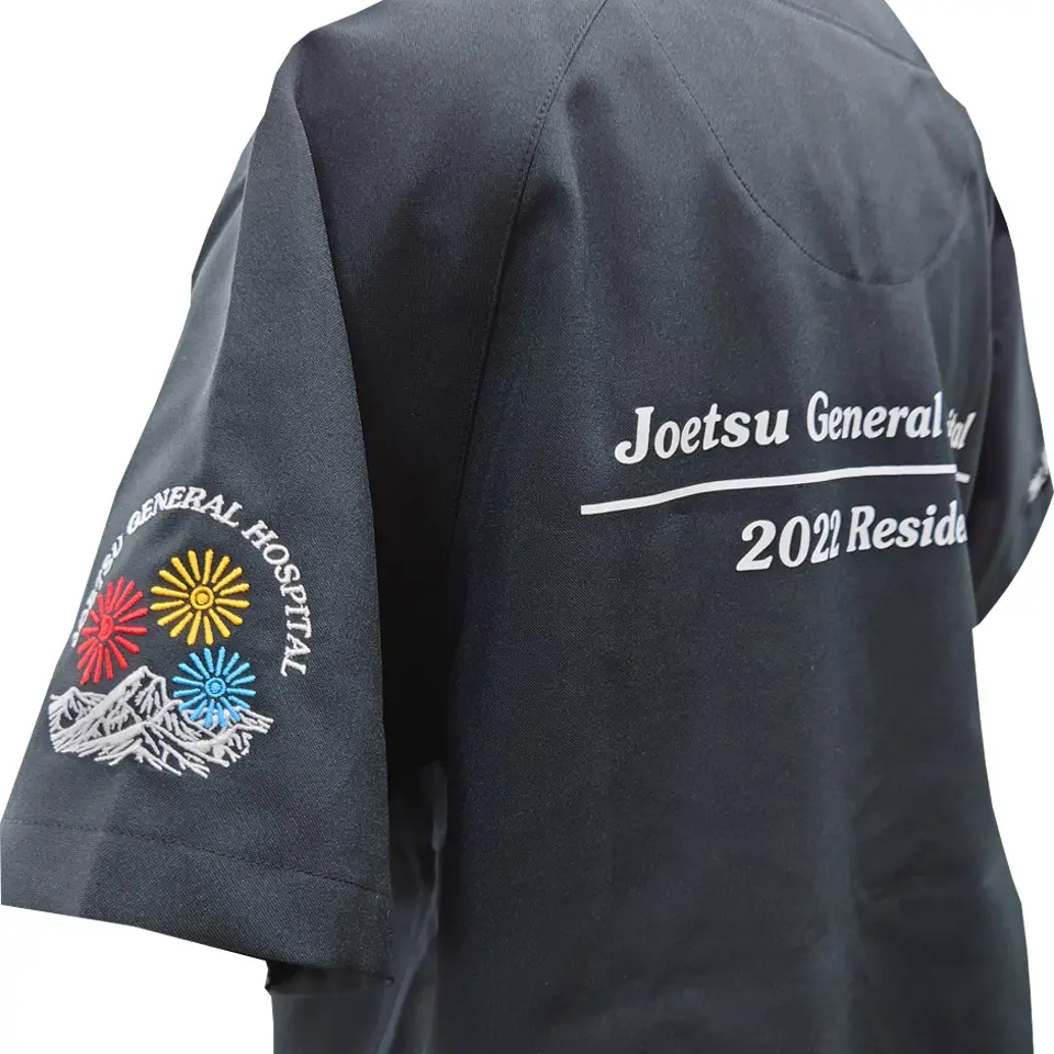 背中の加工をシルクプリントにすると、色数や枚数にもよりますが、多くの場合は刺繍と比べてコストを低く抑えられます。細かい表現が難しいことや使う色数が増えるとコストが大きく上がることが特徴であり、単色で病院名や大学名、デザインを入れることに向いている加工方法と言えます。