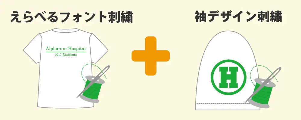 アルファユニで用意しているフォントを使うえらべるフォント刺繍なら、背中の刺繍でもコストを抑えられます。文字ではないデザインを入れたり用意されていないフォントを使うことはできませんが、こちらもアルファユニが用意している簡単な装飾を施すことは可能です。プリントにはない立体的な仕上がりになるため、病院名や大学名のみを入れる場合には使いやすくおすすめ!