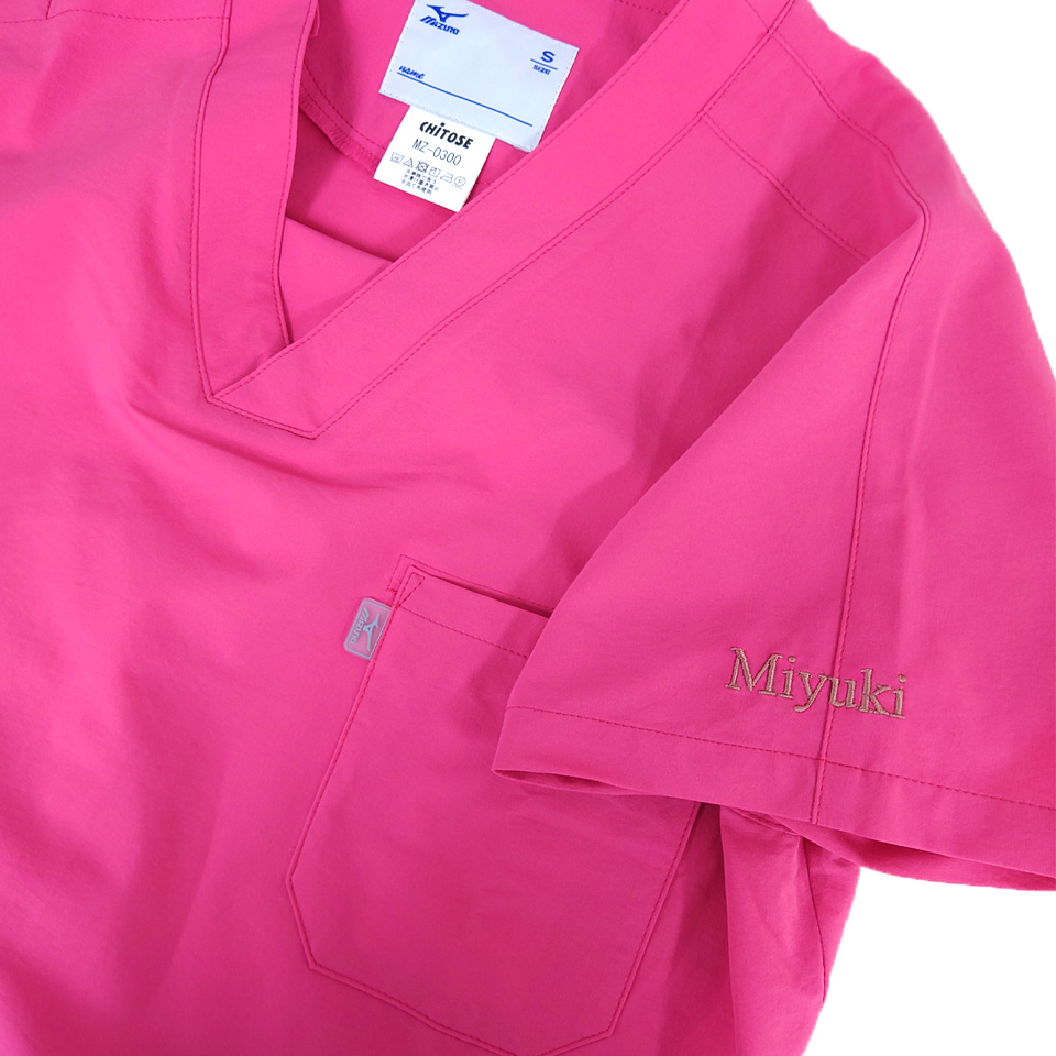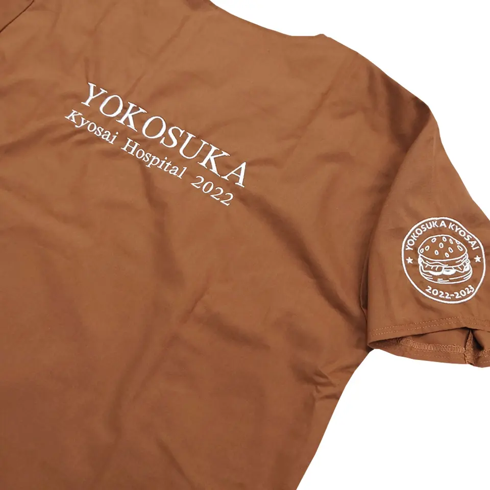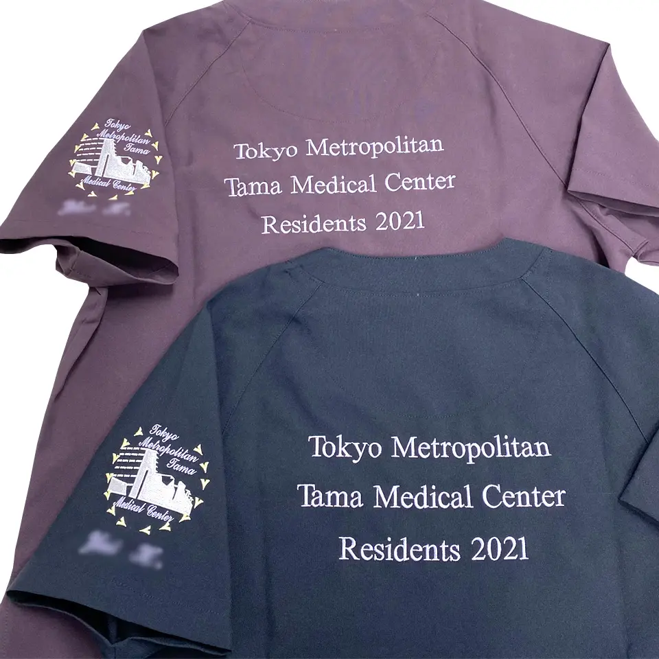 背中のデザイン刺繍と組み合わせて加工するとスクラブ自体の存在感も上がるためおすすめです。