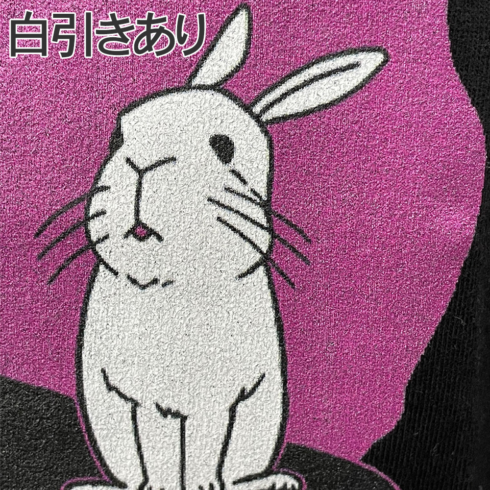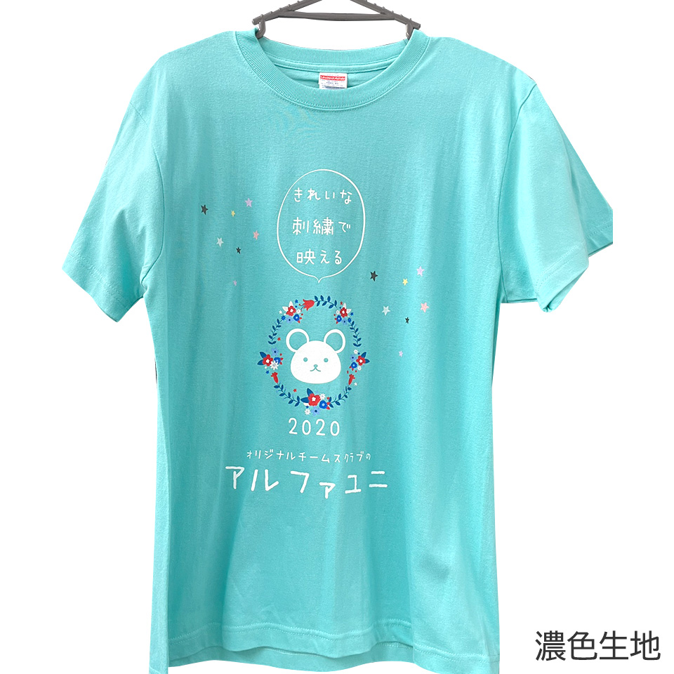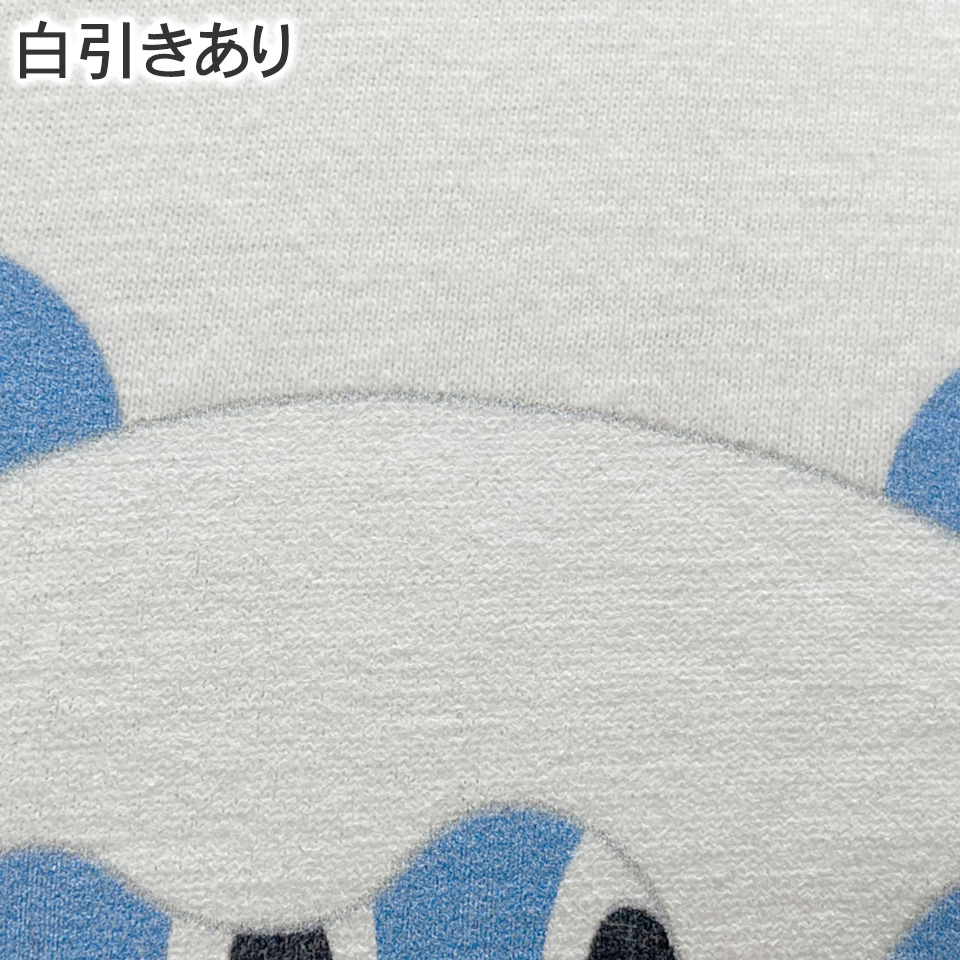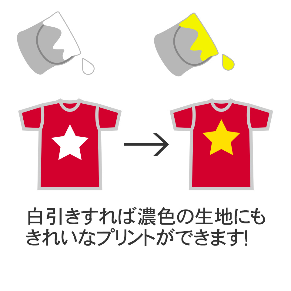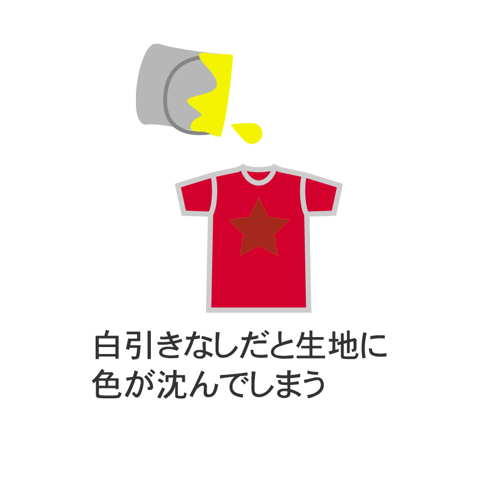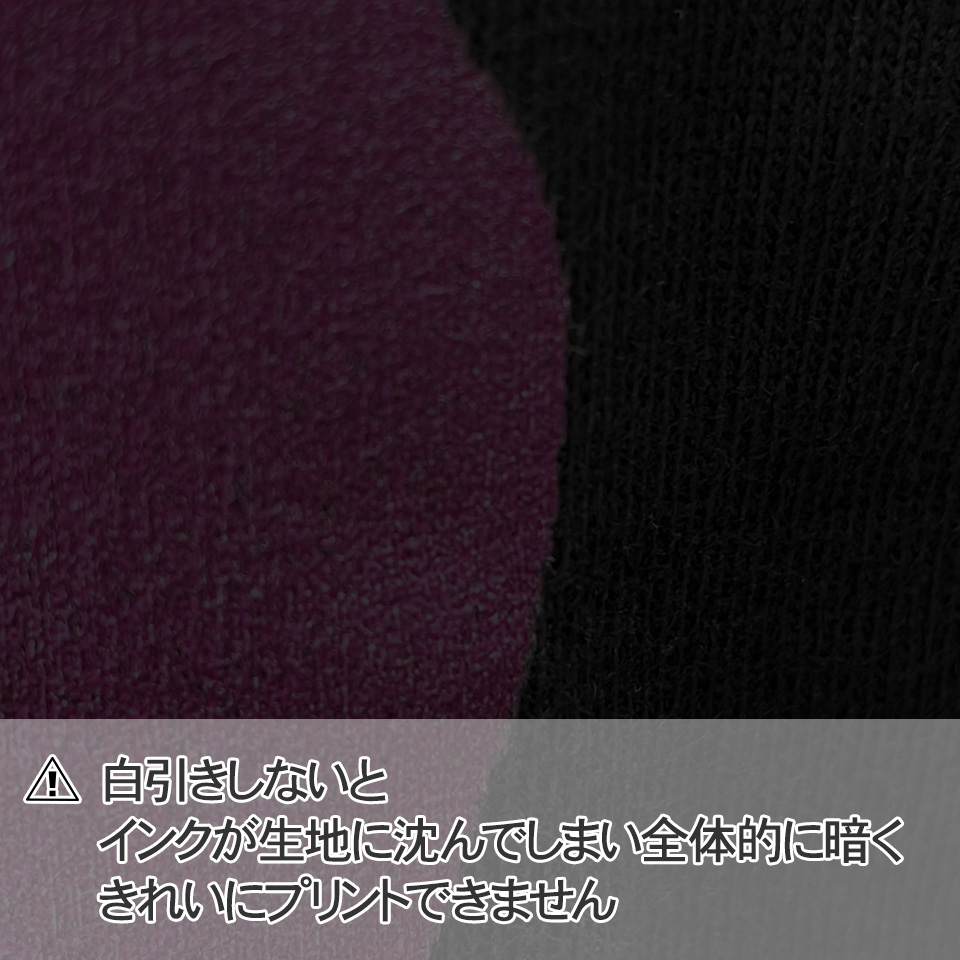 インクを生地に直接吹き付けるプリント方法なので、濃色系生地の場合は生地にインクが吸収され、色がでません。白インクを吹きかけて生地を隠蔽(白引き)する必要があります。