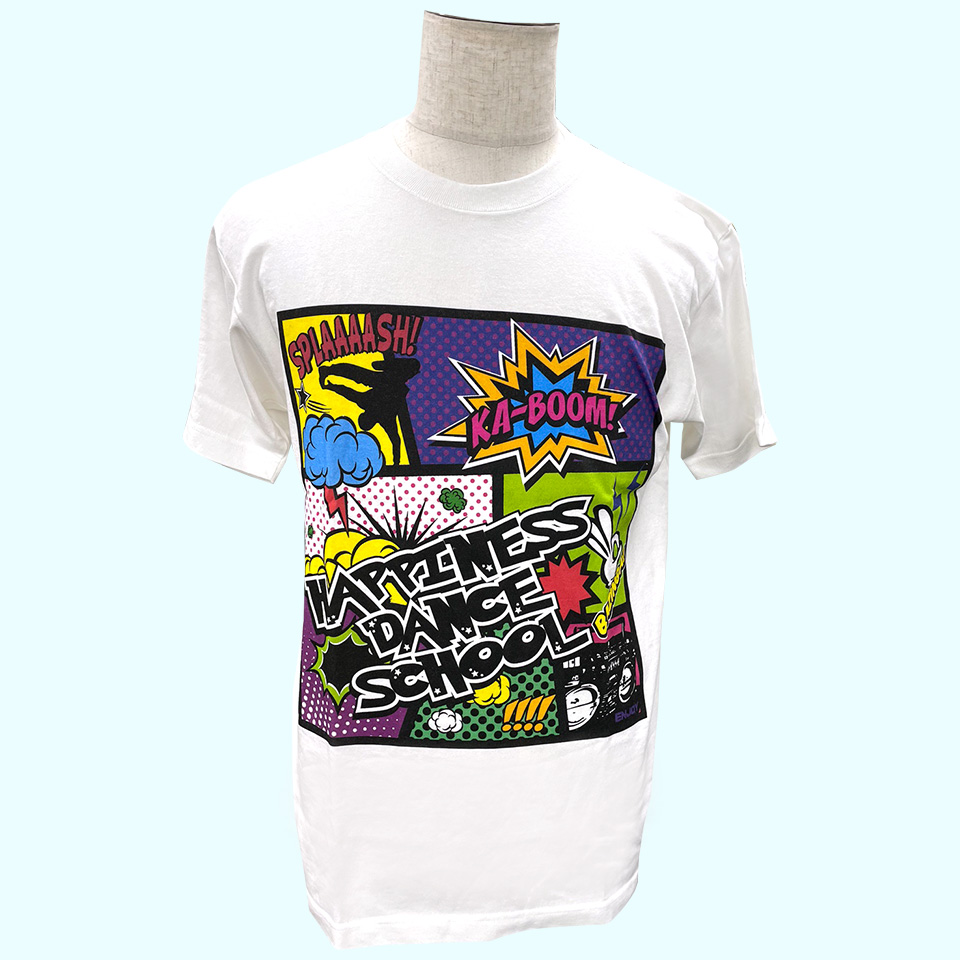 インクを吹きかけてプリントするため、イラストや画像など細かい表現や多色プリントの再現性の精度が高くなります。製品台に生地をセットして、版からインクを落として刷るプリント手法と違い、生地の縫い目やリブなど、凸凹な面に影響されることなく、どこにでもプリントすることができます。ウェア全面にプリントが可能です。また、シートを貼り付ける転写プリントは、生地に馴染みませんが、インクジェットはそのような違和感がないのがメリットです。