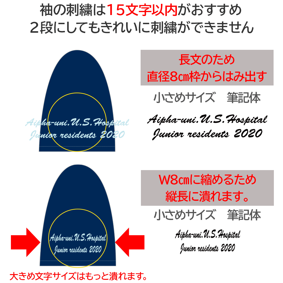 袖に刺繍をする場合は、袖用の刺繍枠、直径8cmを使用します。文字数が多い場合は横の幅を縮めます。※下記画像のように刺繍が潰れます。