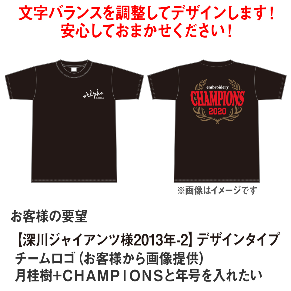 お客様のご要望にお応えして、アルファユニがかっこいいチャンピオンTシャツをデザインします。お見積り無料!