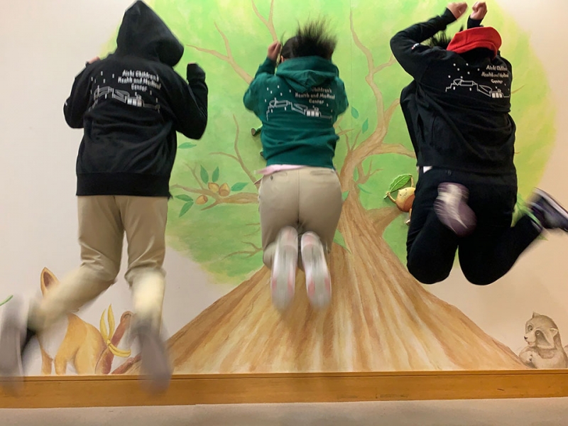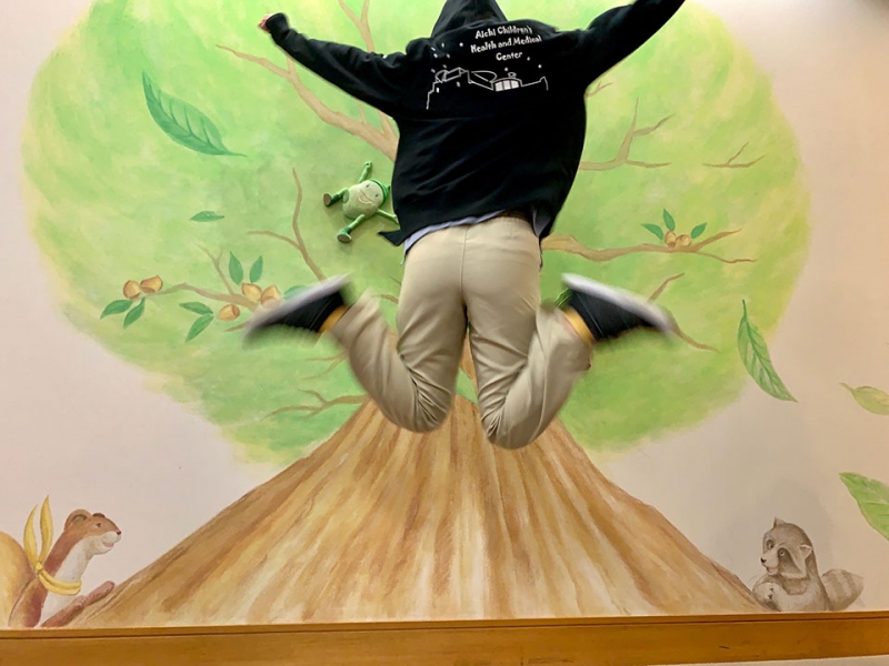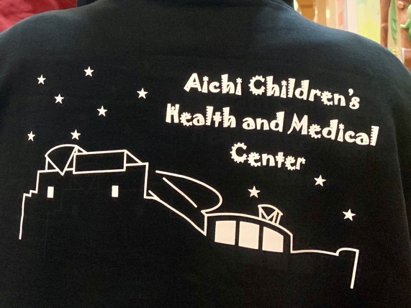 こども専門病院で病院らしくない病院を目指す当センターの考えをイメージした遊び心を加えた字体のセンター名とセンターのシルエットを背中にシルクプリントして頂きました。