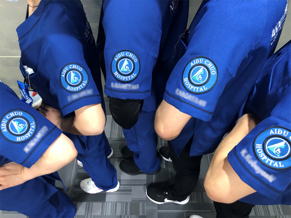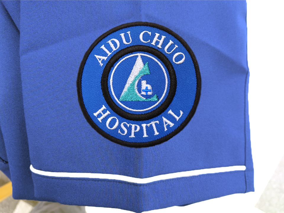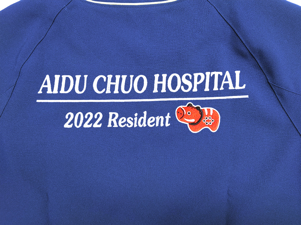 背中に有り文字刺繍と赤べこデザインのご当地ワンポイント刺繍、左袖に会津中央病院のロゴマークをデザインした刺繍ワッペンとネーム刺繍をそれぞれ入れさせていただきました。