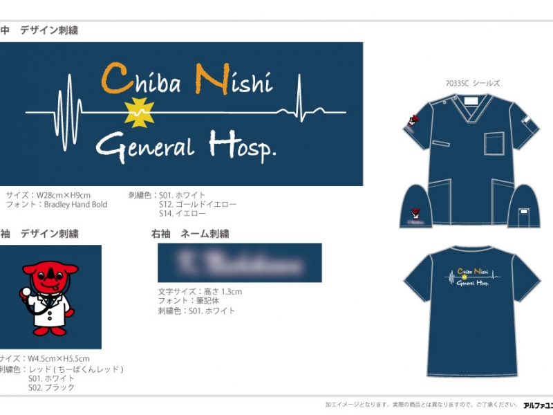 研修医 【NO.311】千葉西総合病院2023年研修医様 7033SC デザイン刺繍ネーム刺繍背中袖 【実績No.311】 千葉西総合病院2023年研修医様-オリジナルチームスクラブのご紹介です。 このたびは製作のご依頼、および画像のご提供ありがとうございました。 お客様からのコメント 商品を確認いたしました。想像以上の仕上がりに驚いております。 からのコメント このたびはアルファユニをご利用いただきましてありがとうございました! ●マーキングの詳細説明 右袖にドクターをイメージしたチーバくんのデザイン刺繍とネーム刺繍、背中に心電図の波形と手書き風フォントの病院名を組み合わせたデザイン刺繍を入れさせていただきました。 この記事をシェア その他おすすめ事例 【No.17】焼津市立病院様 7003SC 【No.24】長岡赤十字病院研修医様 MZ-0092 【No.50】宮古島徳洲会病院様 7003SC 実績一覧 特集 アルファユニカタログVol.5 刺繍の見た目が変わる?生地の違いと刺繍の差 コックコート・飲食系ユニフォーム特集 全面昇華プリントスクラブ 特集一覧