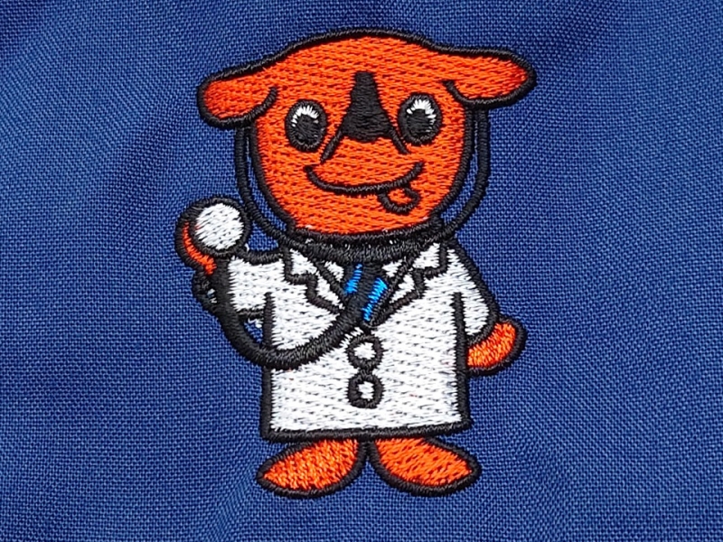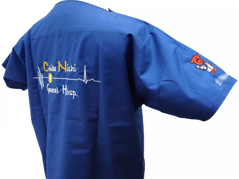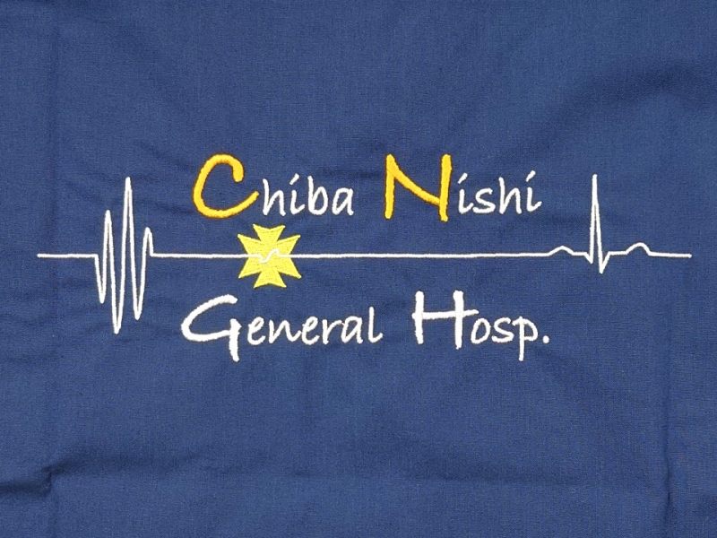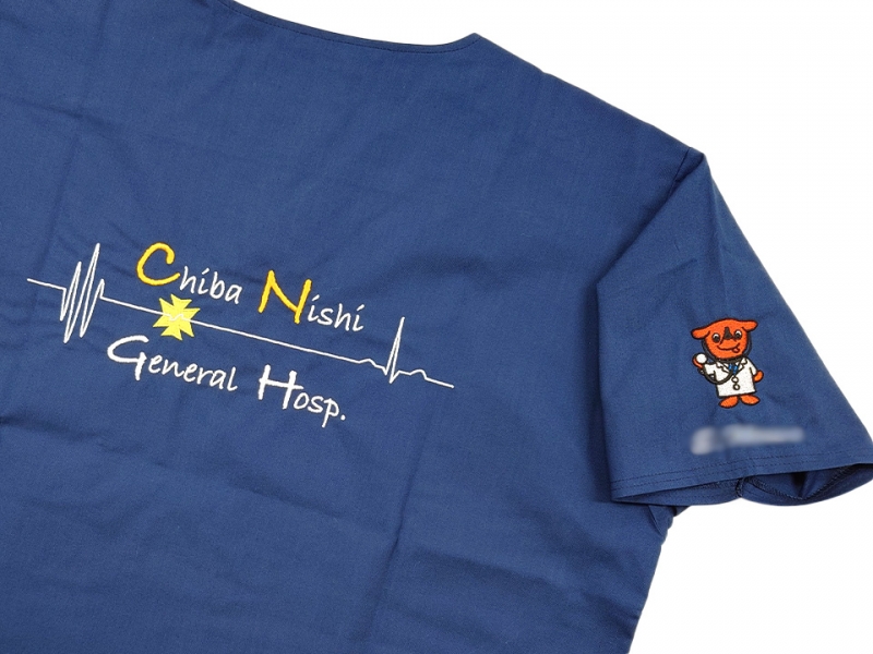 右袖にドクターをイメージしたチーバくんのデザイン刺繍とネーム刺繍、背中に心電図の波形と手書き風フォントの病院名を組み合わせたデザイン刺繍を入れさせていただきました。