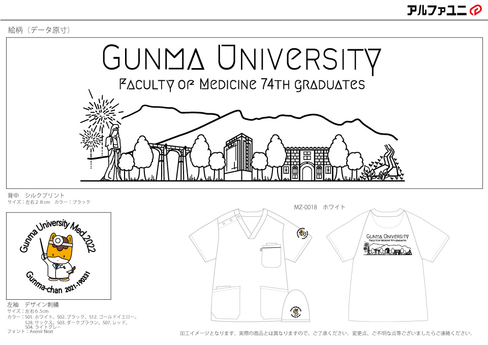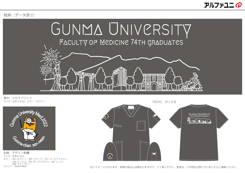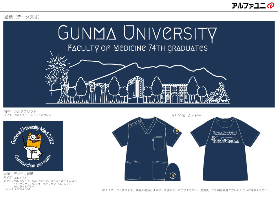 卒業記念 【NO.244】群馬大学医学部2022年卒業生様 MZ-0018 シルクプリントデザイン刺繍プリント 1色背中袖 【実績No.244】 群馬大学医学部2022年卒業生様-デザインスクラブのご紹介です。 背中には、地元の風景をイラスト化してプリント、袖にはご当地キャラクターのドクターコートを着たぐんまちゃんを刺繍で入れました。このたびは製作のご依頼ありがとうございました。 晴天の日に外出で撮影いただいたので、集合写真が大変良く撮れていますね。画像のご提供ありがとうございました! お客様からのコメント この度は素敵なスクラブを作成していただき、誠にありがとうございました。 私たちの作成開始時期が遅れてしまったためご迷惑をお掛けすることもありましたが、迅速に対応していただき感謝しております。 お送りしたデザインは忠実に再現されており、色や肌感も含めて同学年から大変好評です。 卒業してしまいますが、最後に全員でスクラブを作ることができたのは大変思い出に残りました。 このスクラブを着て、新天地でも頑張っていきたいと思います。この度は誠にありがとうございました。 からのコメント このたびはアルファユニをご利用いただきましてありがとうございました! ●マーキングの詳細説明 左袖に医師の格好をしたぐんまちゃんのデザイン刺繍、背中に大学名と高崎白衣大観音や富岡製糸場といった群馬の名所のデザインをシルクプリントで入れさせていただきました。 2021年卒業生の方々の実績はこちら! 2020年卒業生の方々の実績はこちら! この記事をシェア その他おすすめ事例 【No.2】福島県立医科大学様 Z1004 【No.4】大学医学部医学科LaRa 8th卒業生様 DS-2001 【No.5】東京医科大学2015年卒業生様 7000SC 実績一覧 特集 アルファユニカタログVol.5 刺繍の見た目が変わる?生地の違いと刺繍の差 コックコート・飲食系ユニフォーム特集 全面昇華プリントスクラブ 特集一覧