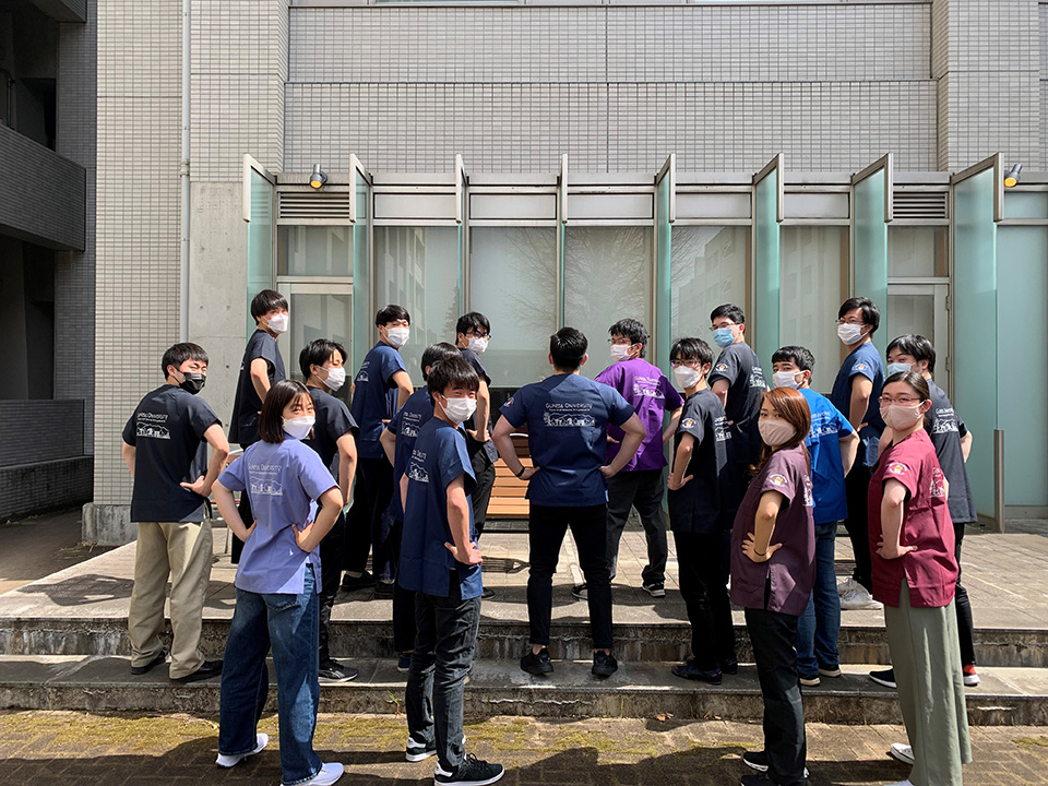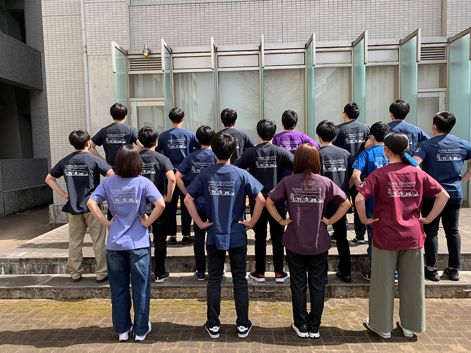 左袖に医師の格好をしたぐんまちゃんのデザイン刺繍、背中に大学名と高崎白衣大観音や富岡製糸場といった群馬の名所のデザインをシルクプリントで入れさせていただきました。