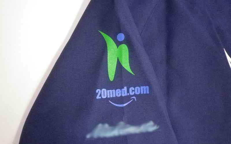 背中・左袖はシルクプリント、左袖のプリント下にネーム刺繍を入れたオリジナル・スクラブです。