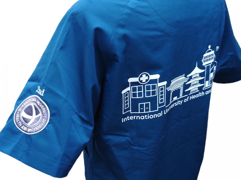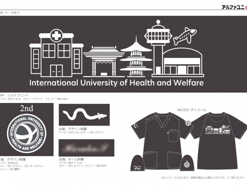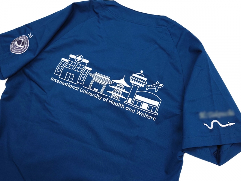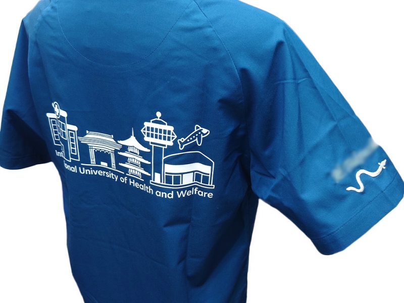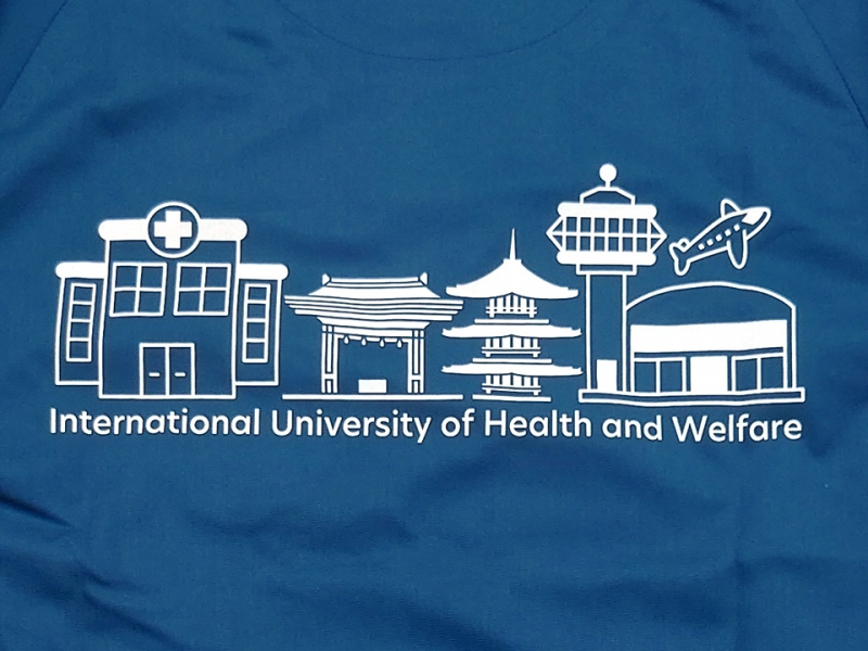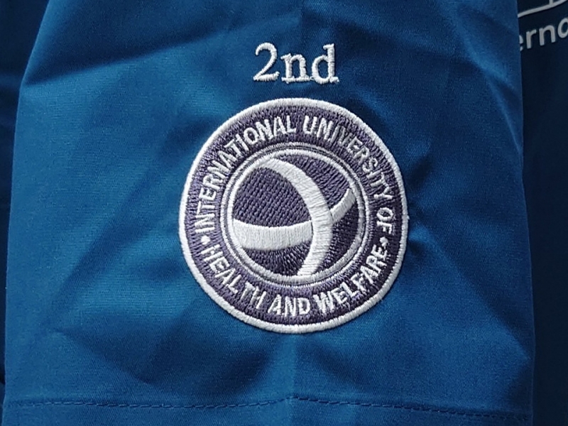 左袖に国際医療福祉大学のロゴマークのデザイン刺繍と「2nd」の文字のえらべるフォント刺繍、右袖にうなぎのデザイン刺繍とネーム刺繍、背中に同大学のキャンパスがある成田市をイメージしたデザインのシルクプリントをそれぞれ入れさせていただきました。
