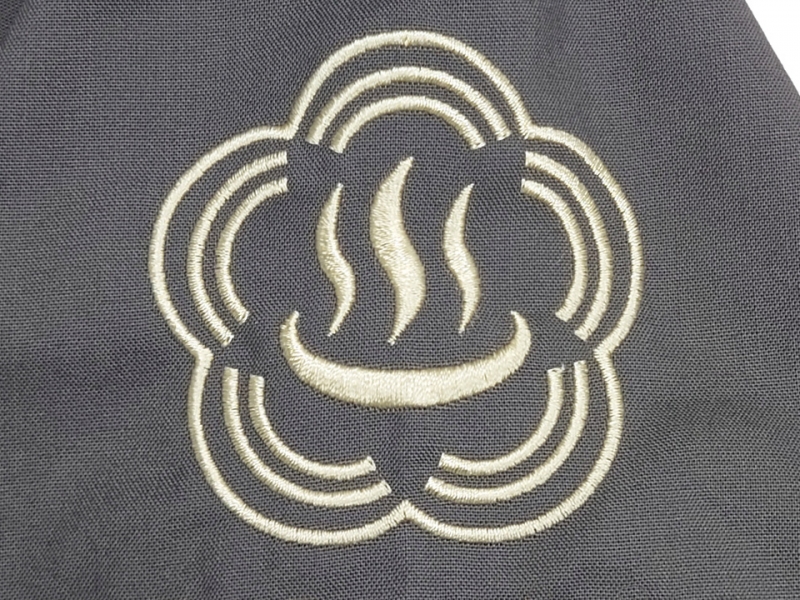 背中にヤシの木のデザイン刺繍、右袖に温泉をイメージしたデザイン刺繍とネーム刺繍を入れさせていただきました。