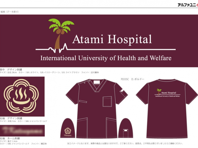 チームスクラブ 【NO.289】国際医療福祉大学熱海病院様 7033SC デザイン刺繍ネーム刺繍背中袖 【実績No.289】 国際医療福祉大学熱海病院様-オリジナルチームスクラブのご紹介です。 お客様からのコメント 想像以上の出来栄えで大満足です! ありがとうございました。 からのコメント このたびはアルファユニをご利用いただきましてありがとうございました! 背中、右袖に刺繍を入れさせていただきましたが、熱海のご当地をしっかりアピールしたデザインとなっています。 このたびは製作のご依頼、および画像のご提供ありがとうございました。 「想像以上の出来栄え」というご評価をいただき、とても嬉しく思います! ●マーキングの詳細説明 背中にヤシの木のデザイン刺繍、右袖に温泉をイメージしたデザイン刺繍とネーム刺繍を入れさせていただきました。 この記事をシェア その他おすすめ事例 【No.3】嘉悦大学インキュベーション同好会様 1525PH(廃番) 【No.6】北野病院様 MZ-0092 【No.8】佐久総合病院様 7003SC 実績一覧 特集 アルファユニカタログVol.5 刺繍の見た目が変わる?生地の違いと刺繍の差 コックコート・飲食系ユニフォーム特集 全面昇華プリントスクラブ 特集一覧