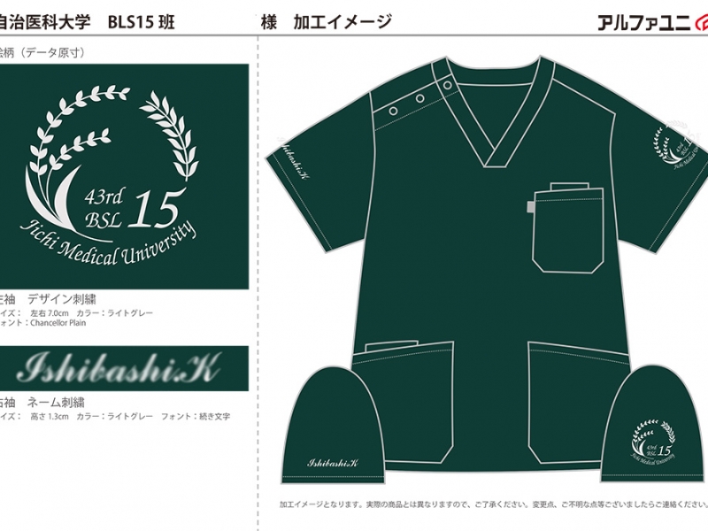 チームスクラブ 【NO.139】自治医科大学BSL15班様 MZ-0018 デザイン刺繍ネーム刺繍袖 【実績No.139】 自治医科大学BSL15班様のオリジナルチームスクラブのご紹介です。 画像のご提供ありがとうございました。 お客様からのコメント 刺繍もきれいにお作りいただきありがとうございます! からのコメント このたびはアルファユニをご利用いただきましてありがとうございました! ●マーキングの詳細説明 左袖にデザイン刺繍、右袖にネーム刺繍を入れさせていただきました。 この記事をシェア その他おすすめ事例 【No.3】嘉悦大学インキュベーション同好会様 1525PH(廃番) 【No.6】北野病院様 MZ-0092 【No.8】佐久総合病院様 7003SC 実績一覧 特集 アルファユニカタログVol.5 刺繍の見た目が変わる?生地の違いと刺繍の差 コックコート・飲食系ユニフォーム特集 全面昇華プリントスクラブ 特集一覧