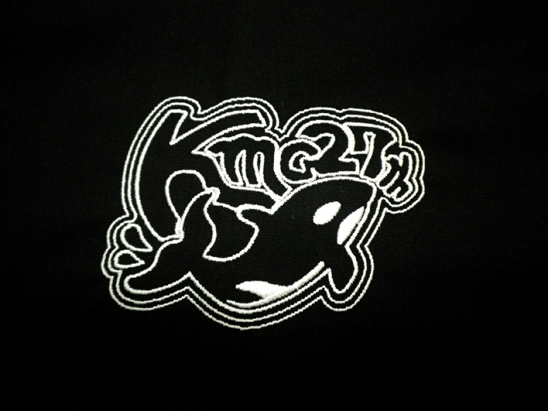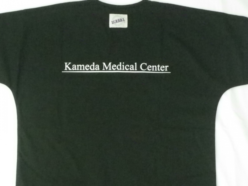 右胸のデザインはデザイン刺繍バージョンとシルクプリントバージョンの2パターン製作しました。統一感を出すための背中のシルクプリントはデザインとカラーは共通でプリントしています。千葉県房総鴨川にある病院ということでシャチのイラストを入れたデザインとなっています。